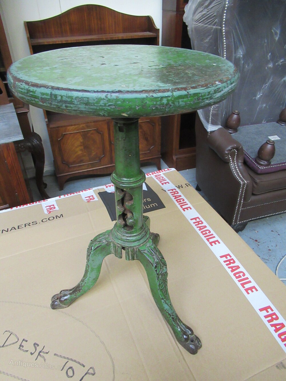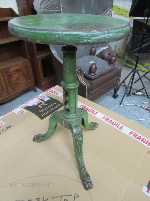 The stool has a four height adjust setting to the pedestal. in old green paint finish.