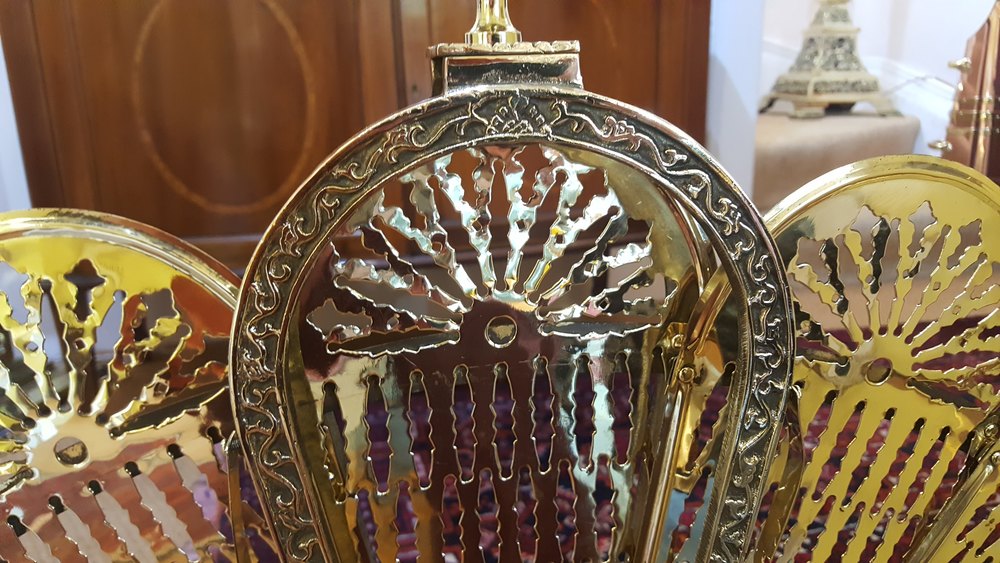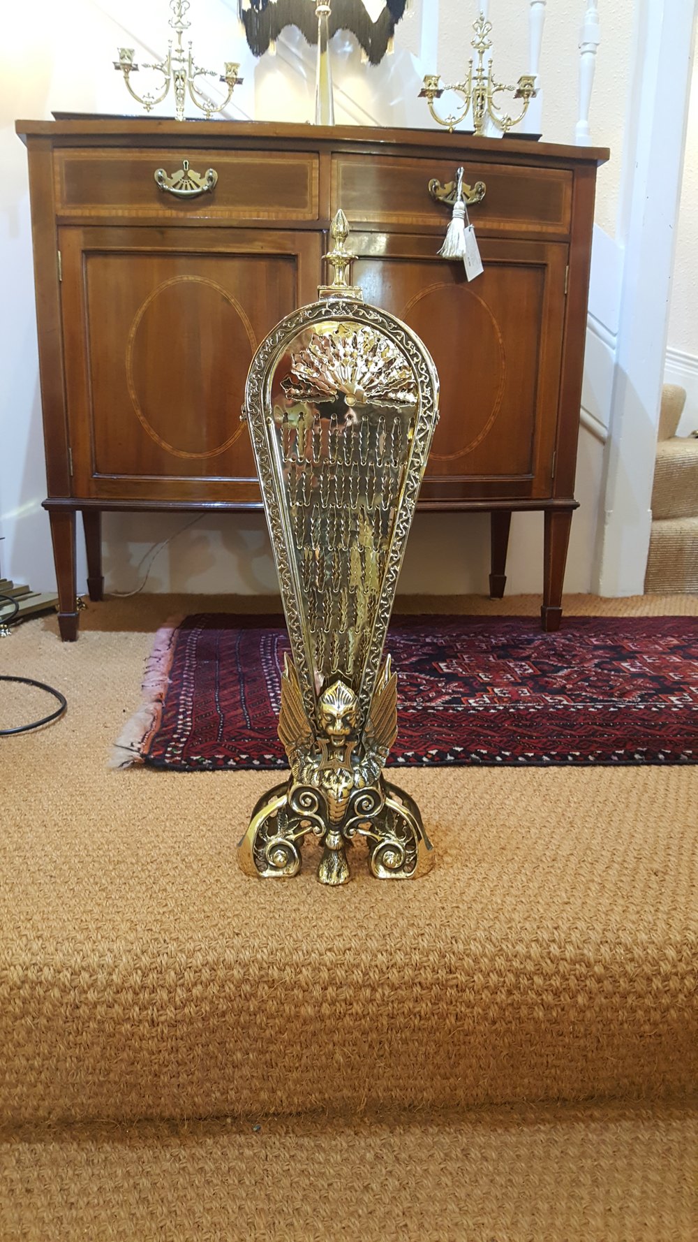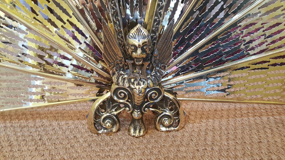 Late Victorian Brass Fan Fire Screen with Gargoyle Base and Filigree Blades 38" (7" shut) w x 3"d x 24"h