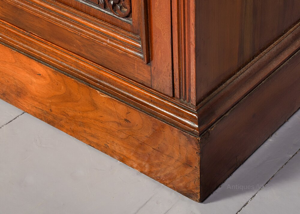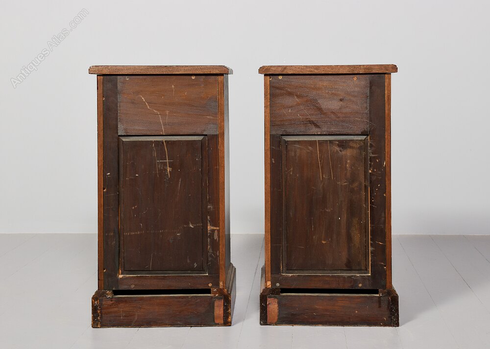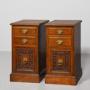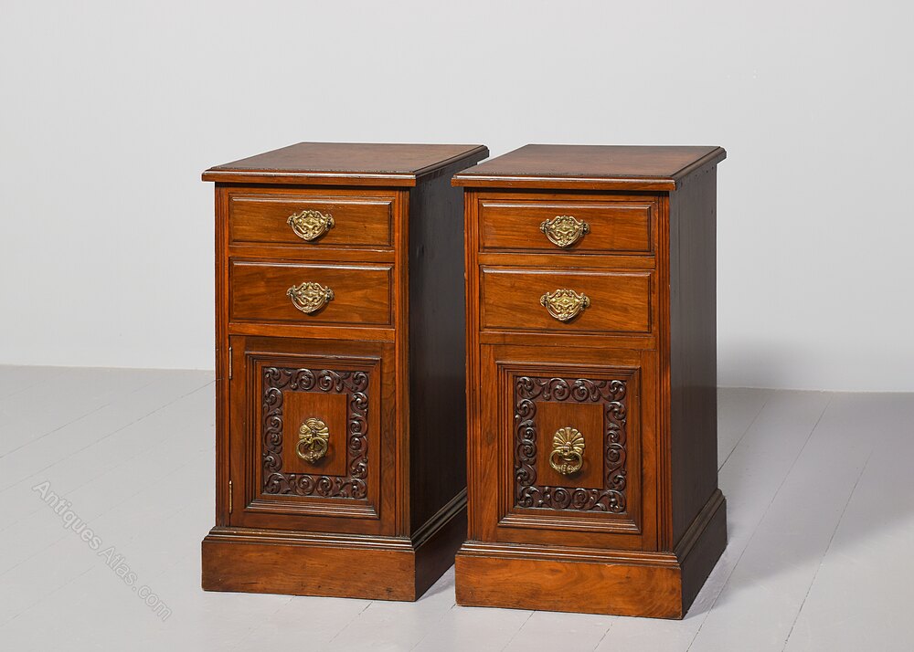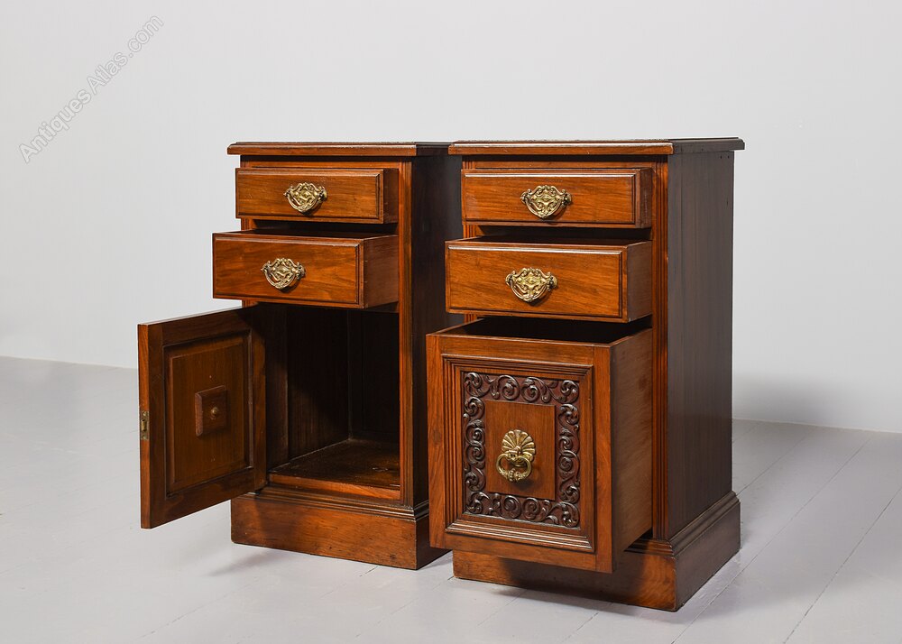 Circa 1880 with alterations. Pair of late Victorian figured walnut bedside lockers. The square tops in figured walnut with moulded fore-edges above two graduated drawers with mahogany drawer liners (sign of quality) and original pierced brass art nouveau brass handles. Beneath are single door with carved moulded sides and central ornate brass handles. Both sitting on enclosed plinth bases.