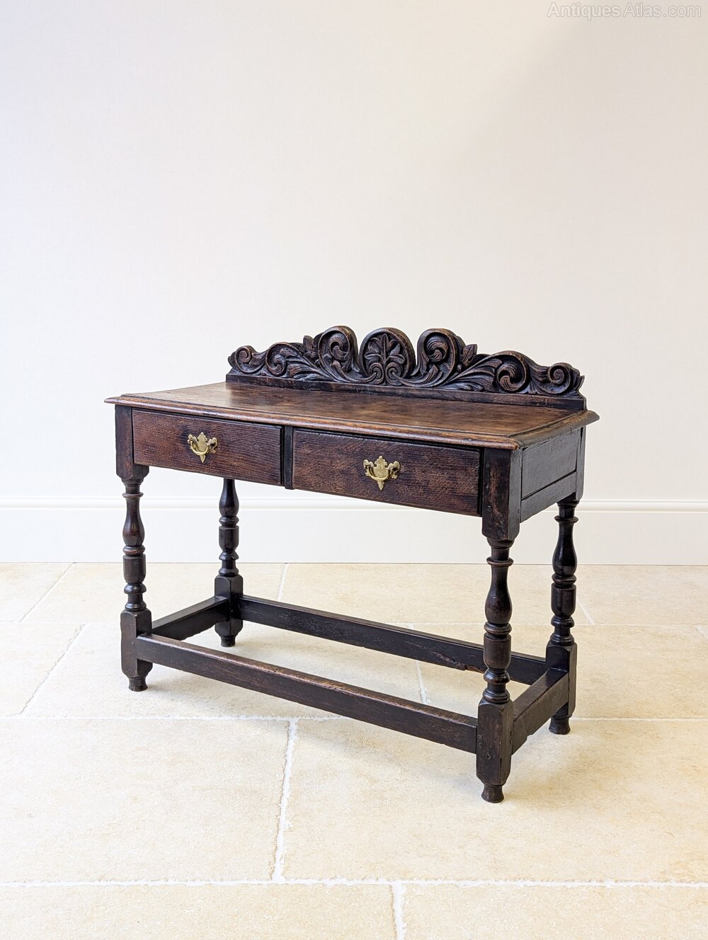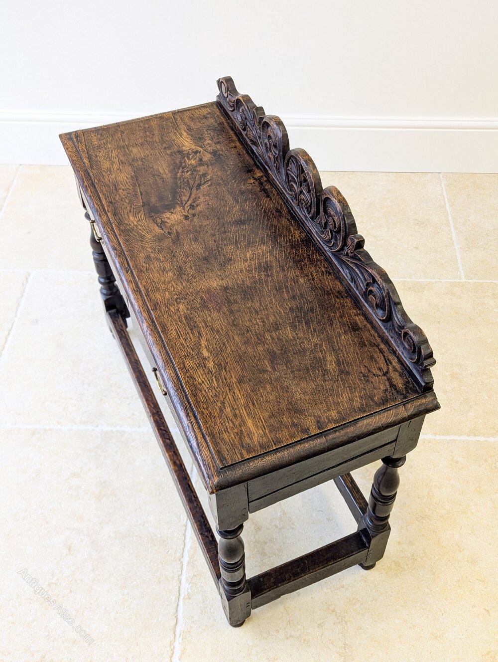 A late Victorian oak side table in the English Jacobean Revival taste with a solid top, two frieze drawers and a carved rear cresting, all standing on turned legs united by a stretcher frame. The oak is well-figured throughout with a pleasing depth of tone and characterful historic wear across the top surface and moulded edge.