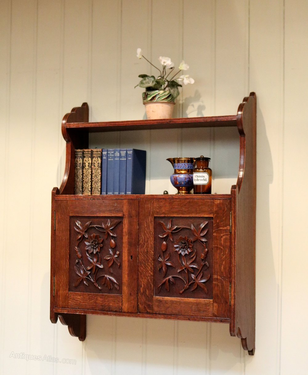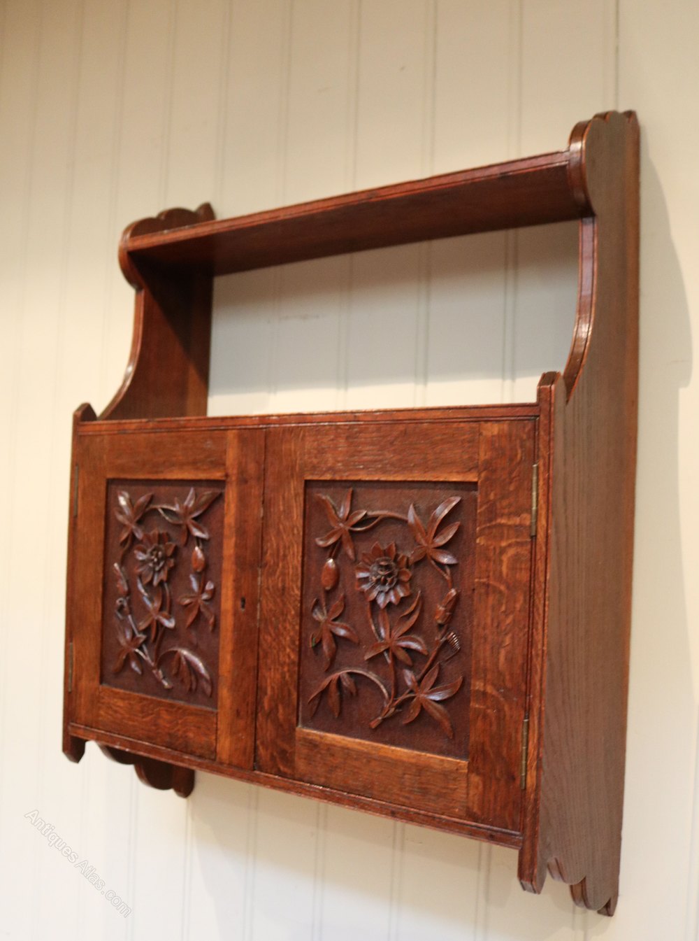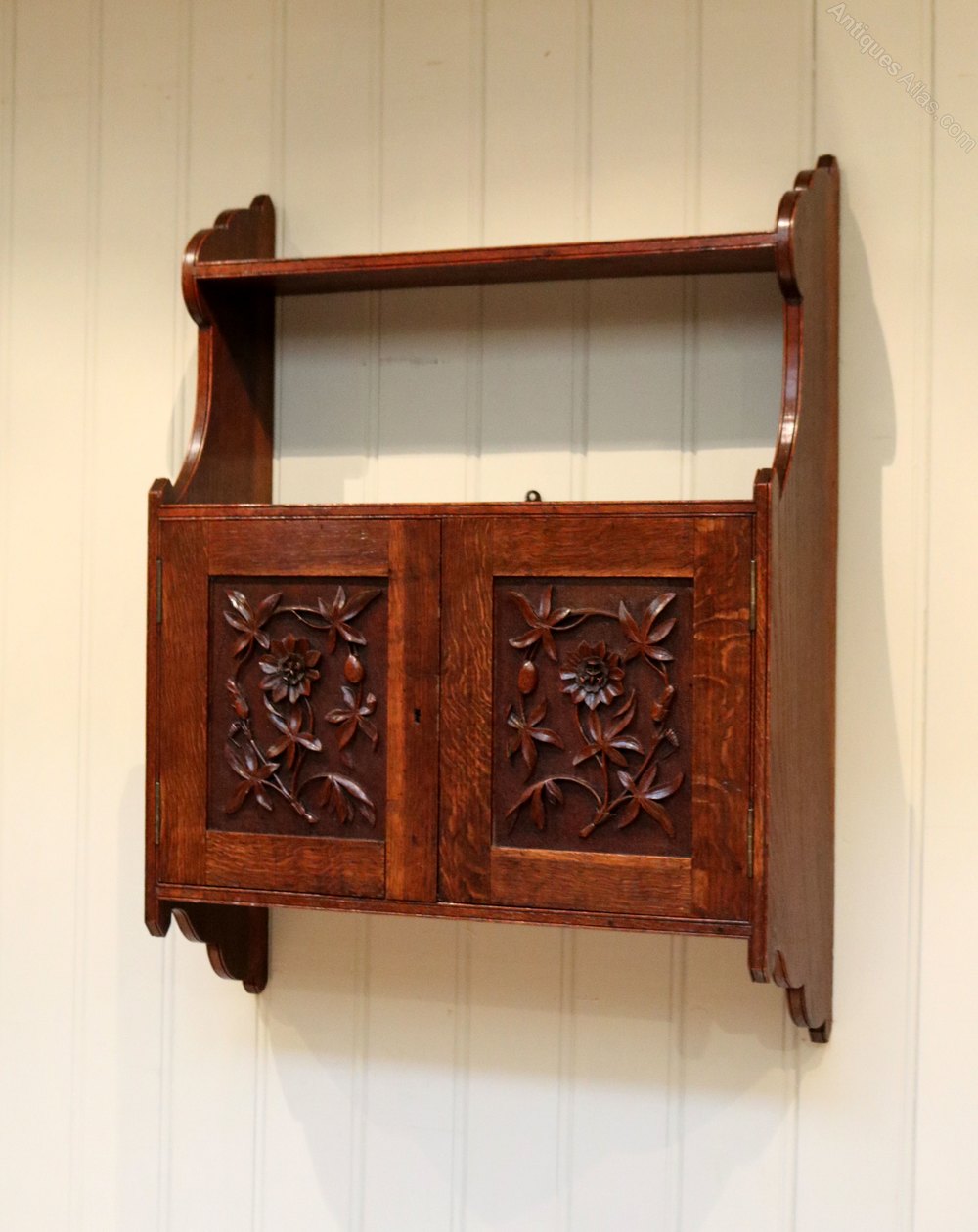Late 19th century oak wall cabinet having a pair of heavily carved doors with a shelf to the top