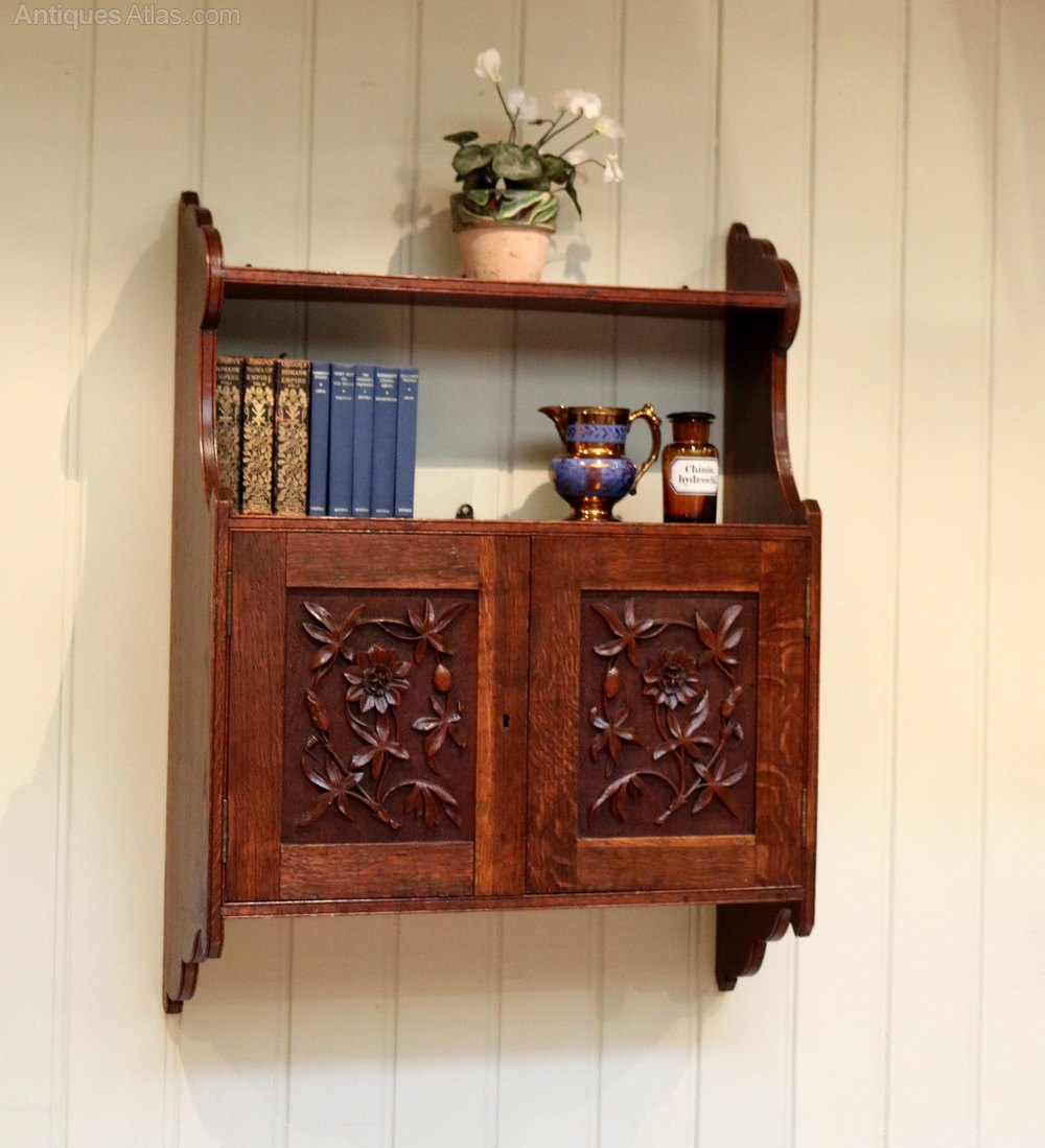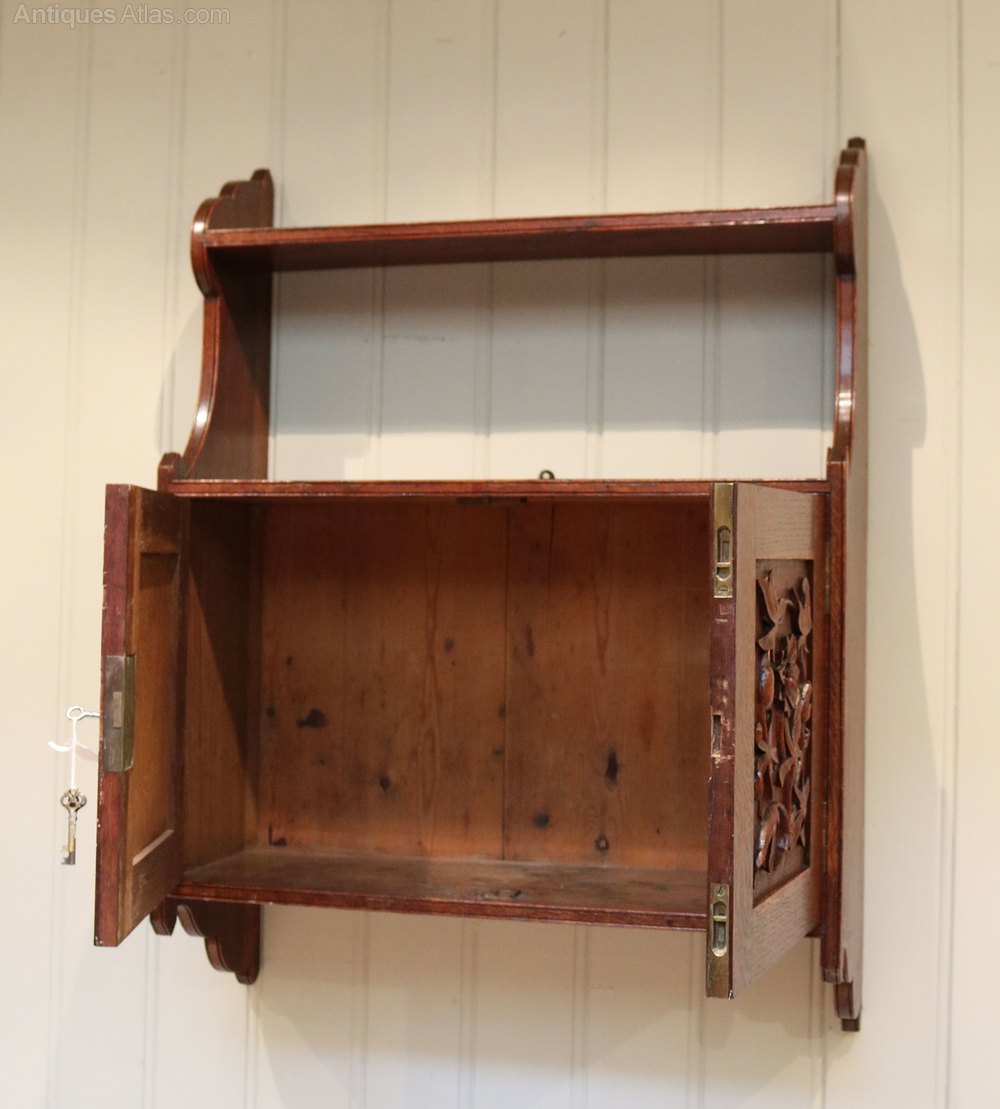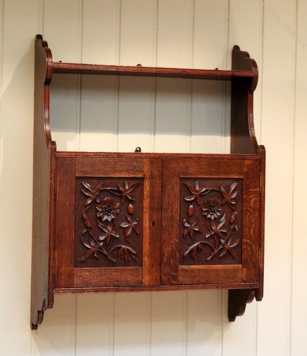 Late 19th century oak wall cabinet having a pair of heavily carved doors with a shelf to the top
