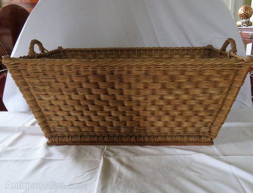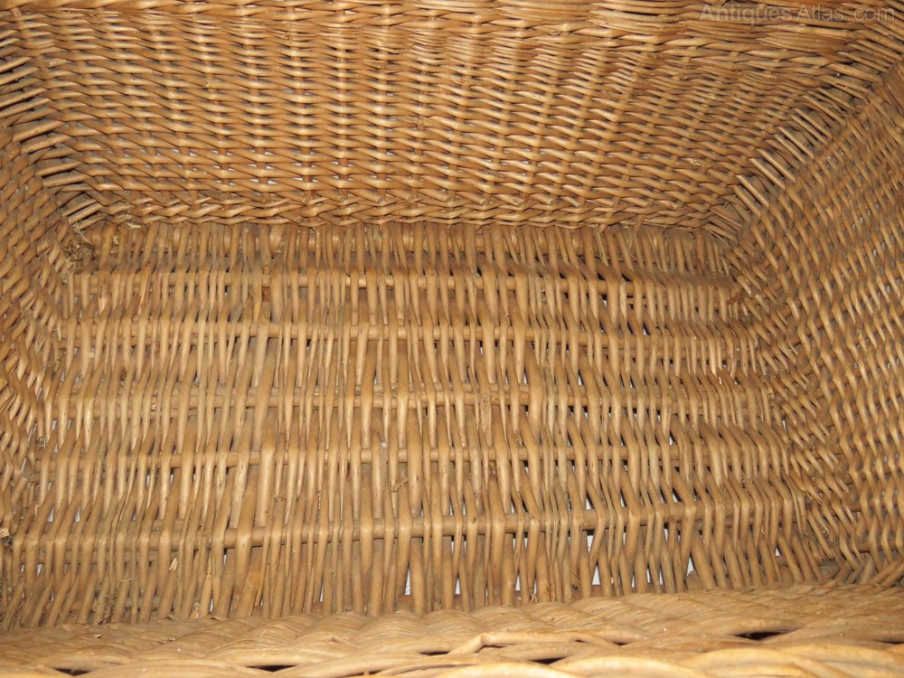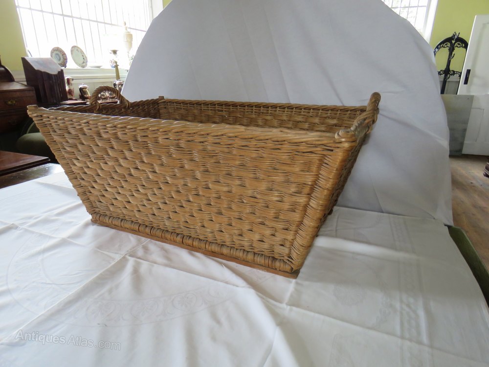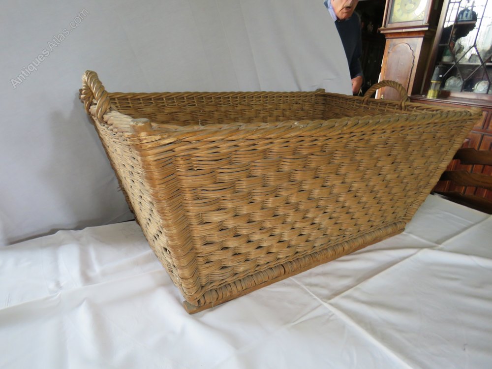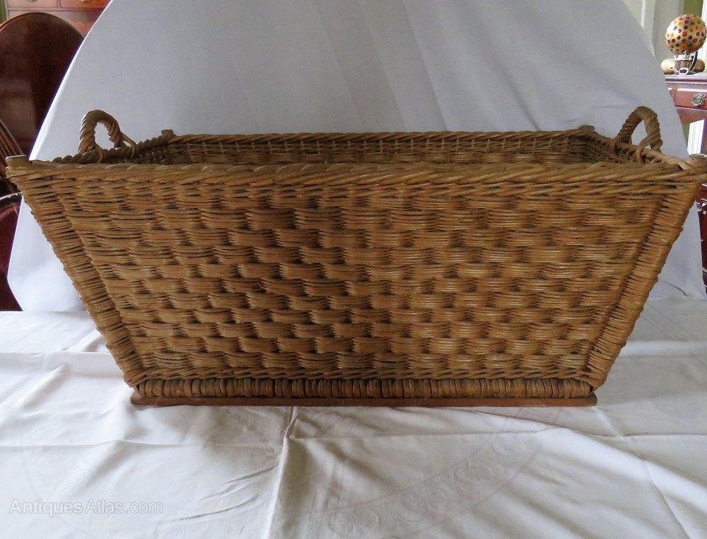 A large laundry basket which would also make an excellent log basket. It is woven willow and dates from the early to mid 20th century.