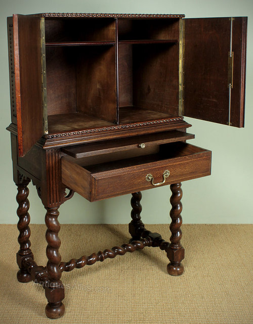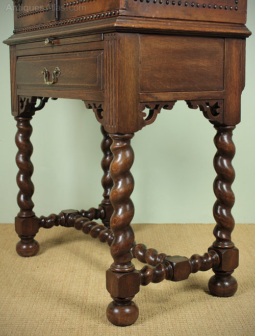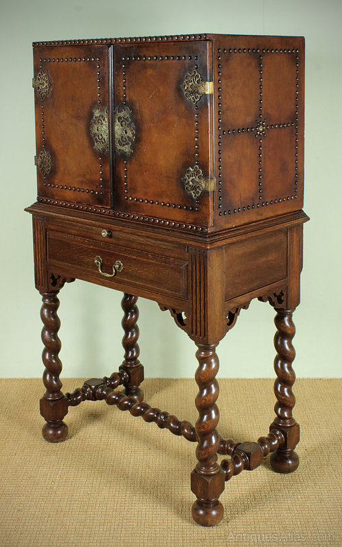 Unusual little Edwardian drinks cabinet on stand c.1910. Leather bound strong box style top with brass stud work and decorative pierced brass hinge and escutcheon plates. On an oak stand with slide-out leaf for pouring drinks and a single drawer below with reeded and pierced detail on stout barley twist legs and stretchers on turned bun feet. Excellent quality with full length ‘piano’ hinges to the doors, a strong locking mechanism and oak drawer linings.