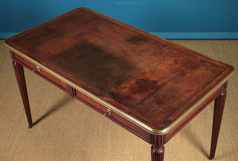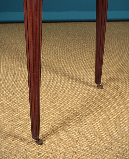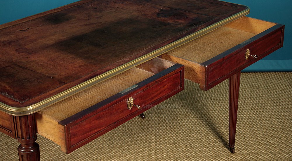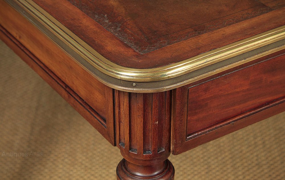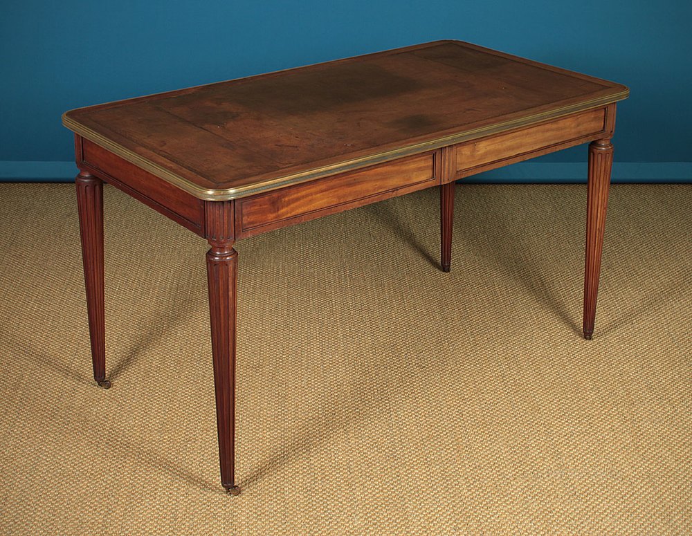 Elegant Edwardian era mahogany writing table c.1910. Good sized top with original leather writing surface and quality brass edge moulding running around each side. Over two oak lined drawers with moulded fronts repeated as banks on the rear. Fluted corners and tapering turned and fluted legs raised on neat little pot castors. Old wear to the leather, otherwise excellent condition, cleaned and polished in our workshops. Keys supplied.