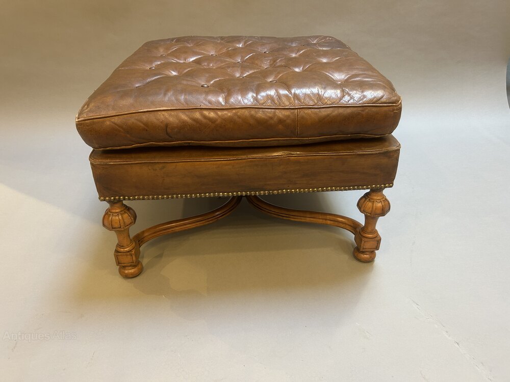 Early C20th in the Queen Anne taste, the buttoned leather squab cushion over close nailed seat, raised on walnut base of facetted legs united by curved stretcher.
