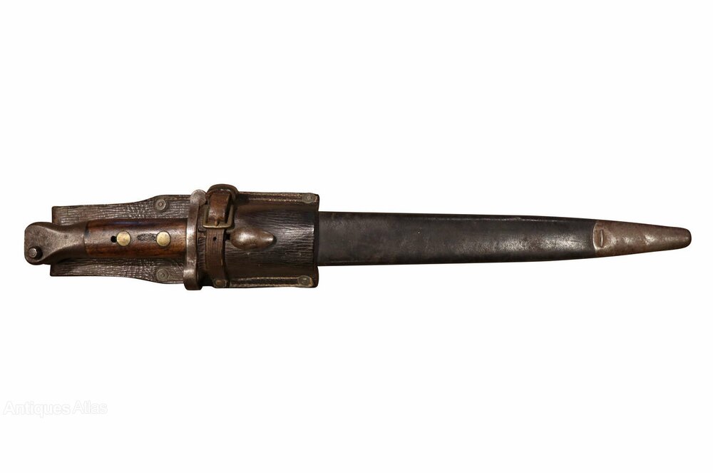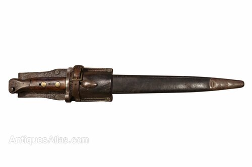 Importantly, the bayonet is accompanied by its original leather scabbard and period frog, the leather having developed a rich, dark tone. The presence of the correct frog significantly enhances both display appeal and collectability.