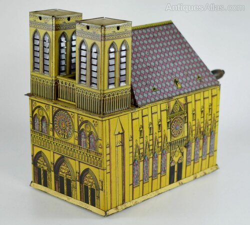 This is a superb and rare to find Antique Tin Lithographed Toy Organ in the form of the Notre Dame Cathedral, made by Leonhard Muller of Nuremburg c1920. It is in good condition with just a little age-related wear but no dings or dents. When turning the handle it plays a tune and is in working order. It is a beautiful piece which measures approximately 16cm by 10cm and 17cm high overall.