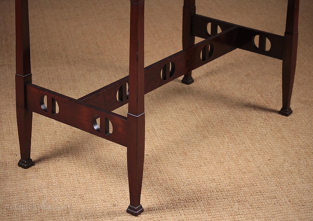 Edwardian era Arts & Crafts movement tile top side table in the manner of Liberty & Co c.1905. Original bottle green and patterned tiled top with mahogany surround on tapering square section legs ending in a stepped block foot and joined with distinctive pierced stretchers. Maker unknown but with design and serial numbers stamped to the underside. Excellent condition.