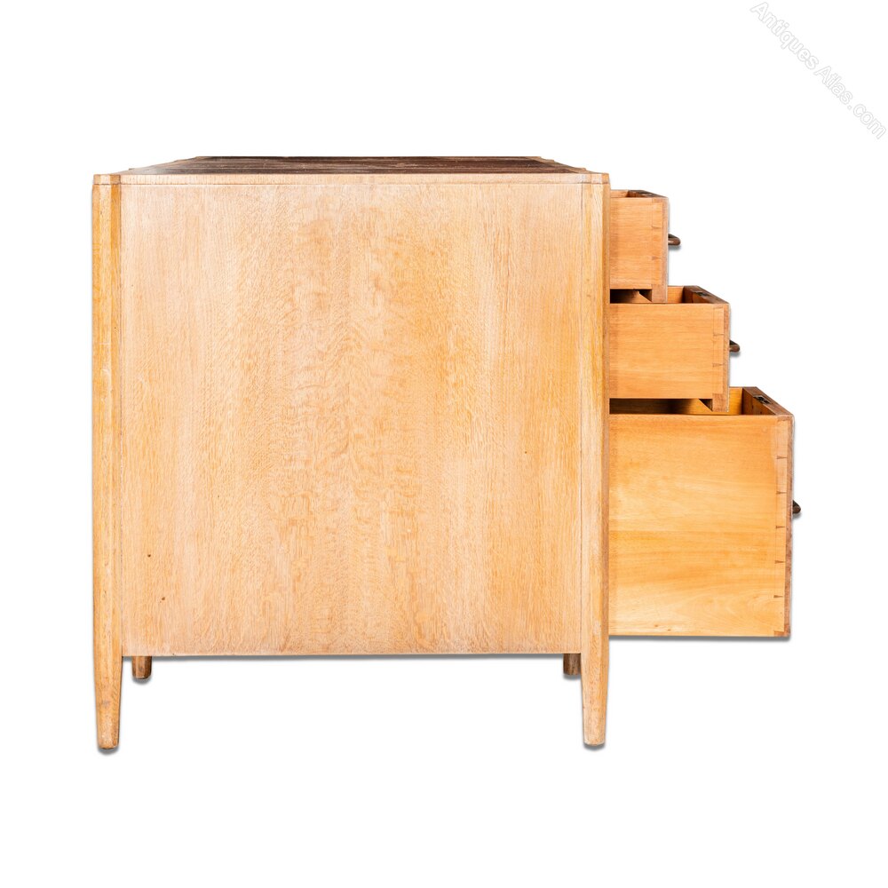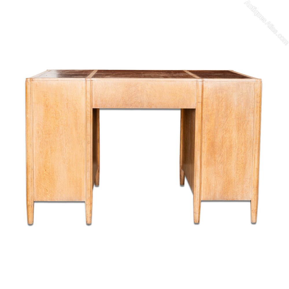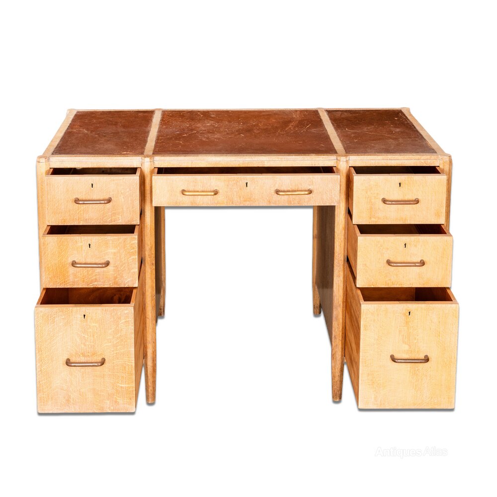 An English Cotswold Style, limed oak, twin pedestal desk by Hobbs & Co (London) c.1925. Constructed in well figured, quarter sawn oak with three-section leather top, octagonal shaped supports, fine London dovetailed drawers and original bronzed drawer pulls.