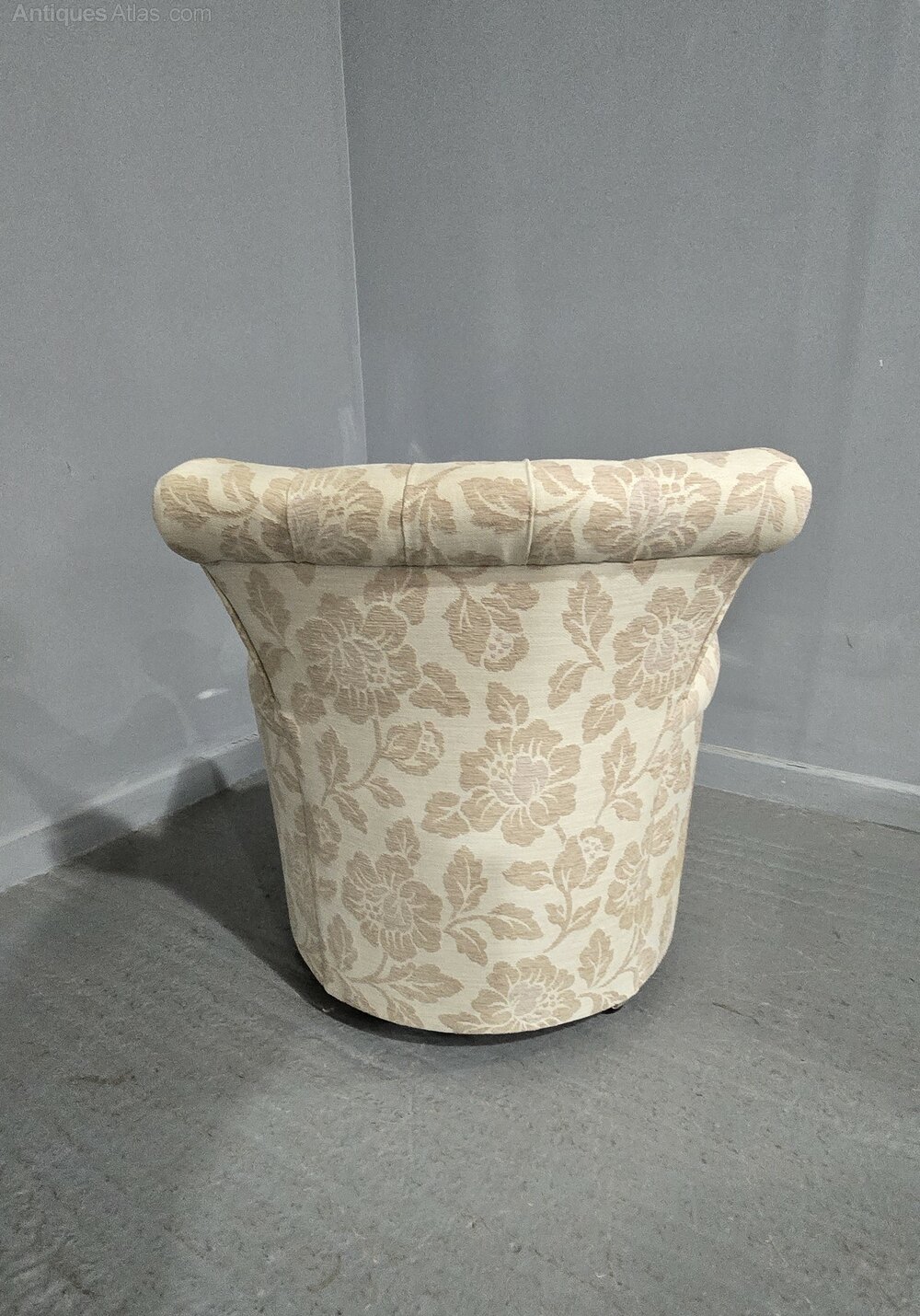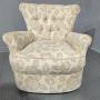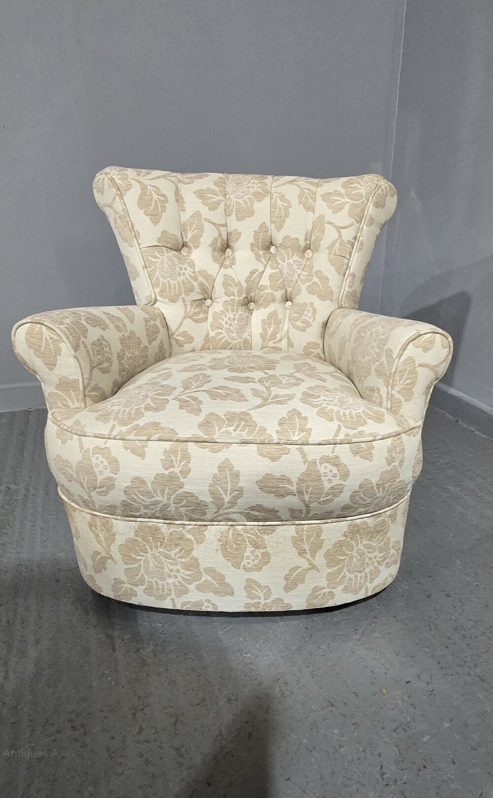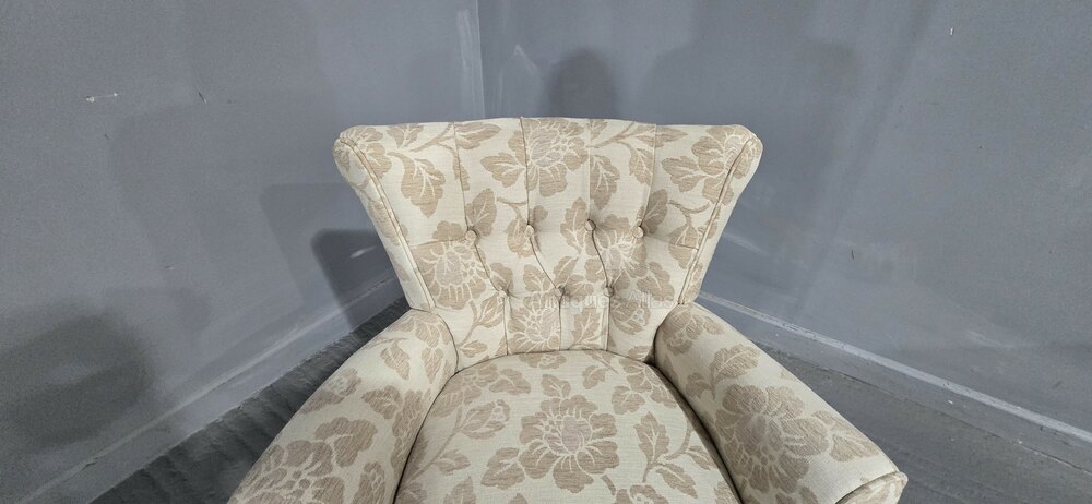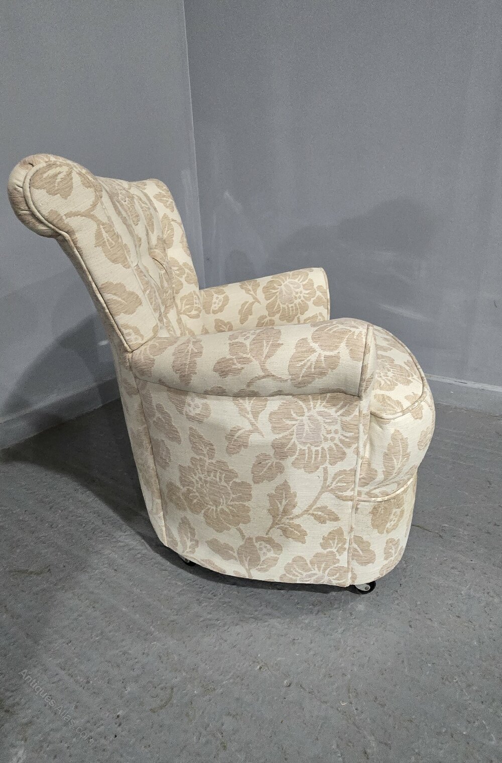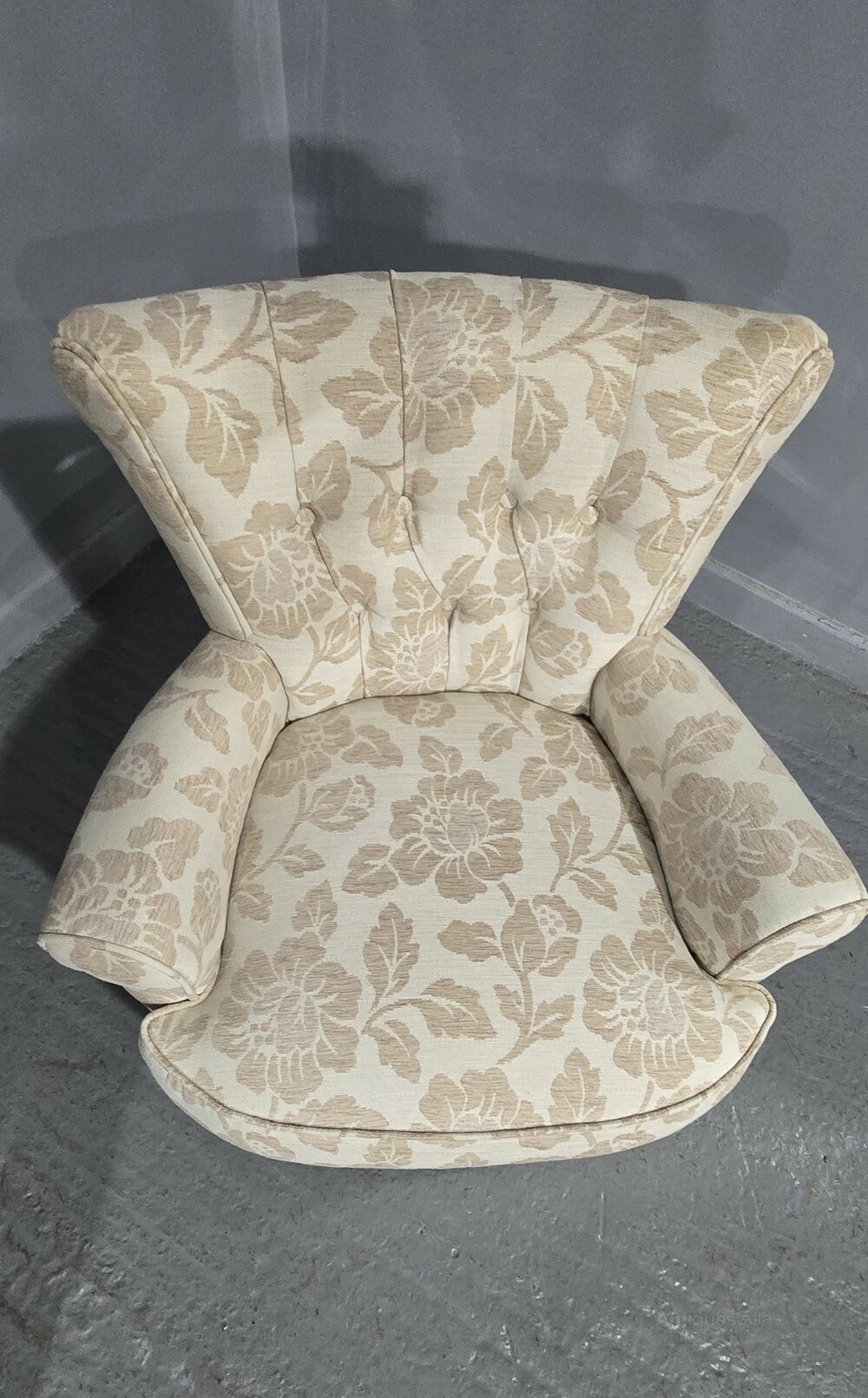 A good cream floral linen covered deep buttoned boudoir chair in excellent overall condition.