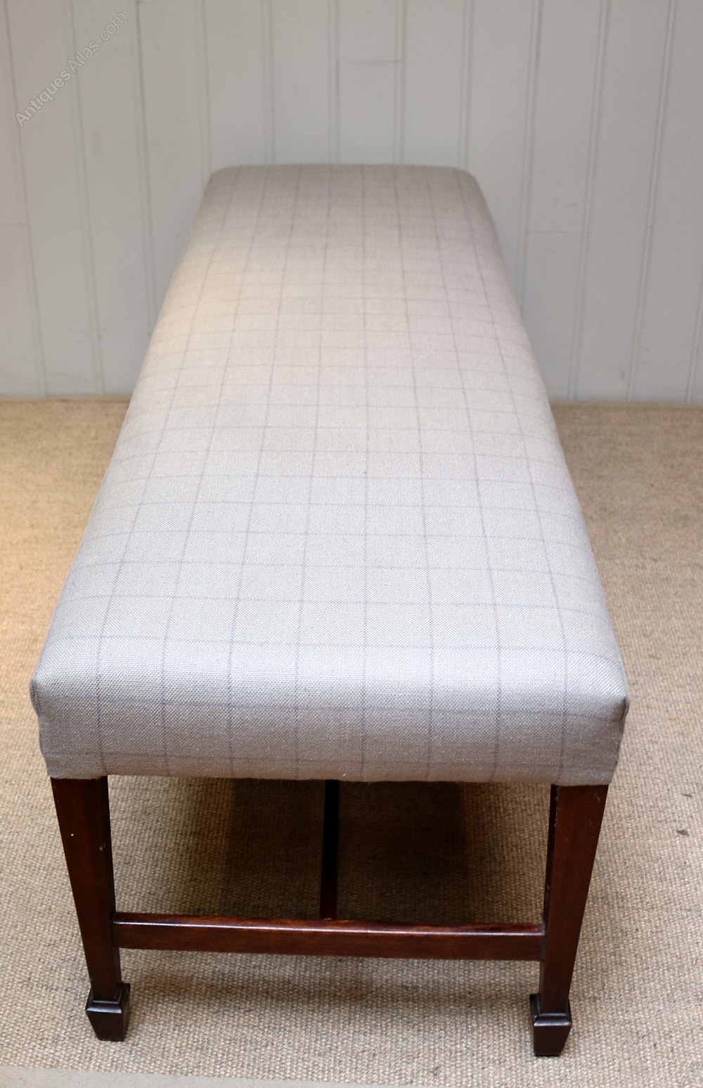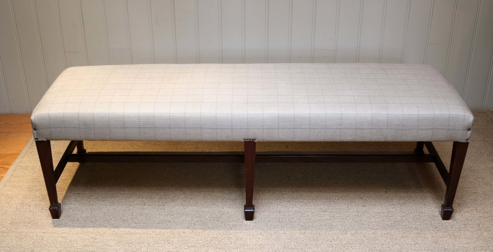 Long upholstered stool raised on three sets of tapering legs with spade feet united by an understretcher