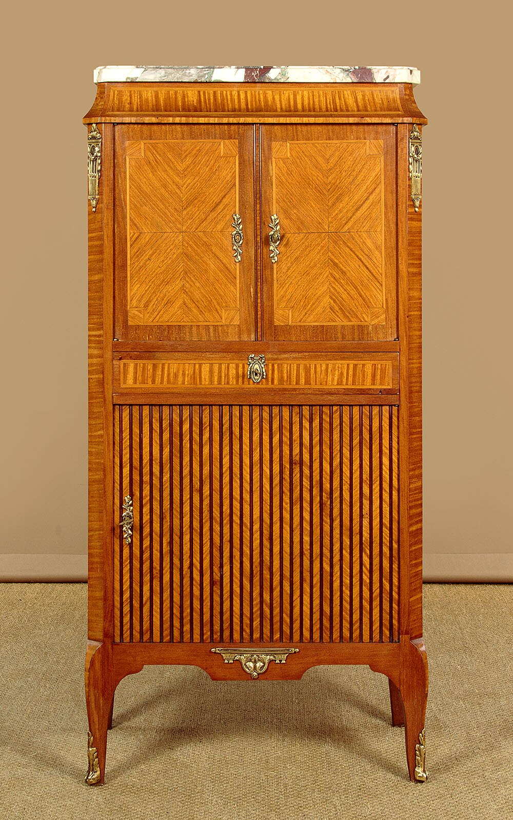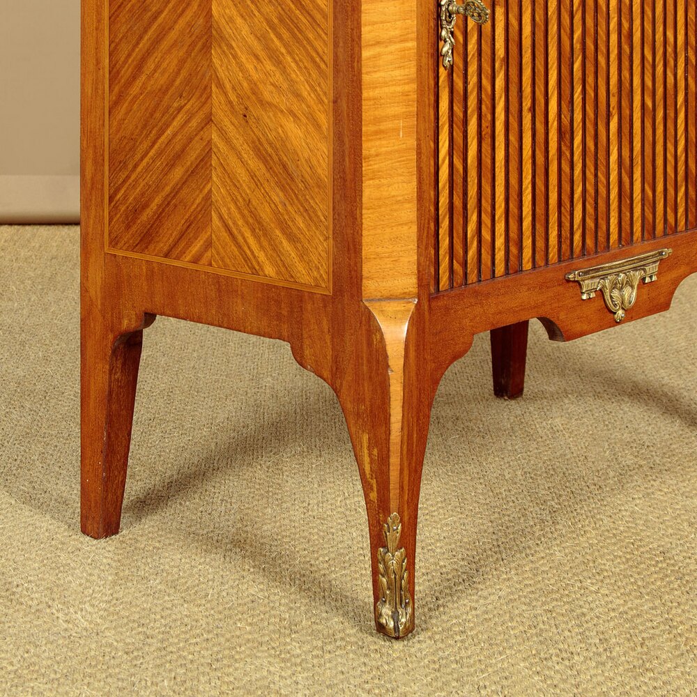 Very smart early 20th.c. French Louis XVI style side cabinet c.1930. Highly figured 1¼" thick marble top with canted corners and a moulded edge. Over a two door cabinet (internal depth 12"), a single drawer and a single door cabinet in the base fitted with a shelf inside. Bright tulipwood veneers arranged in a crossbanded and symmetrical pattern across the front and sides, with inlaid borders and decorative brass mounts and escutcheons. Note the vertical moulding on the lower door to resemble the slats of a tambour. Shaped apron with a brass mount at the centre and shaped front legs with a crossbanded edge brass mounts to the feet. Superior quality with solid mahogany groundwork, oak drawer linings and back panels. Excellent colour and condition, keys supplied for all three locks.