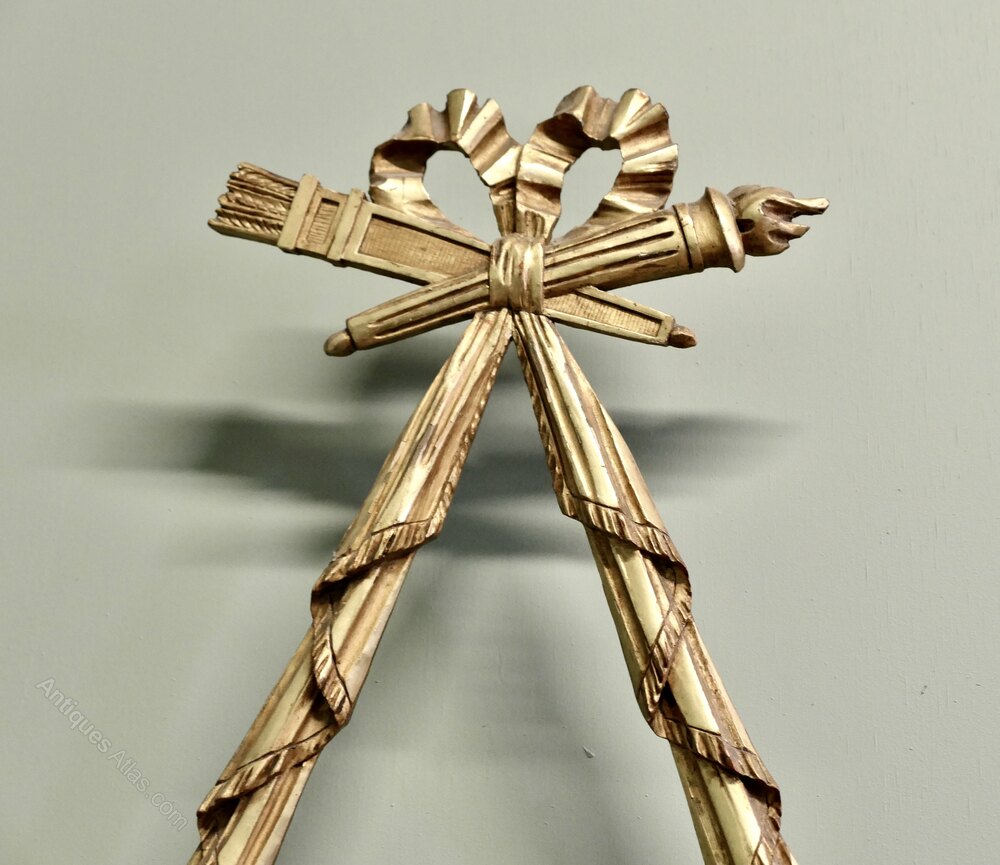 A superb piece hand carved with swags and a large bow at the top giving the impression that the beveled mirror is hanging from a golden ribbon