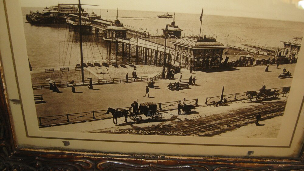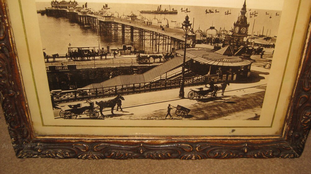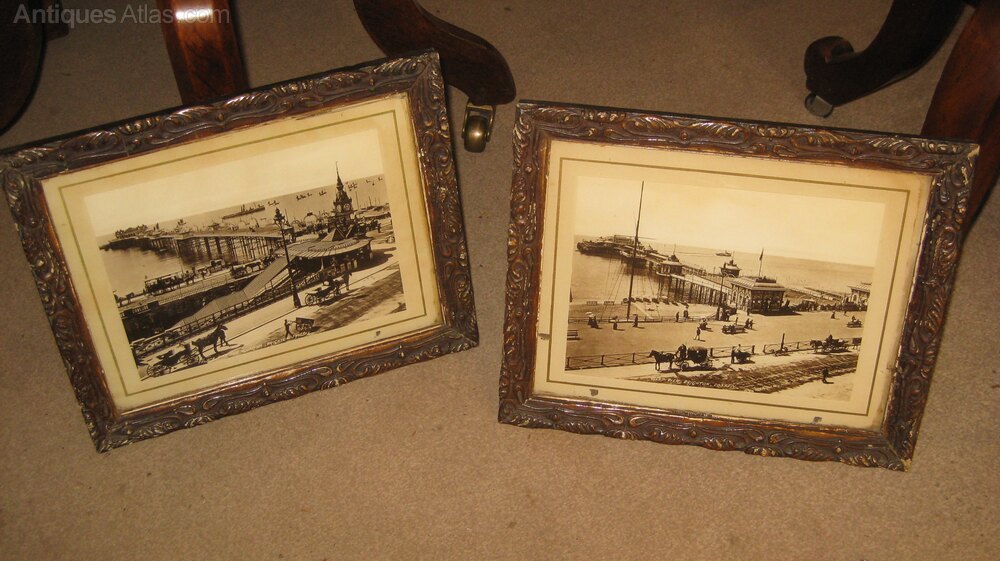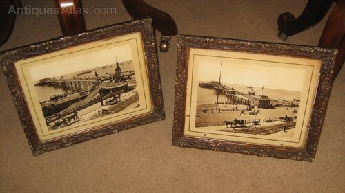 Lovely framed pair of old photographs of the 2 Brighton Piers, the Palace Pier and the now in ruins West Pier. Circa 1900