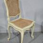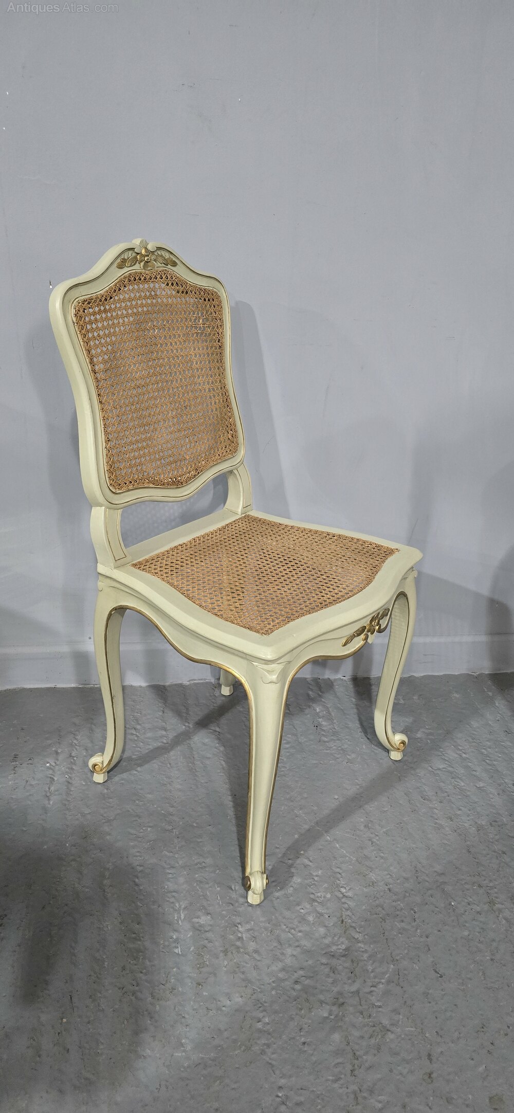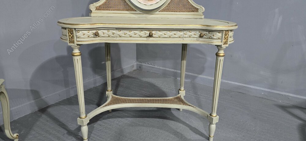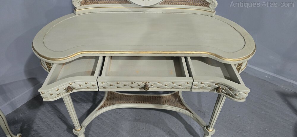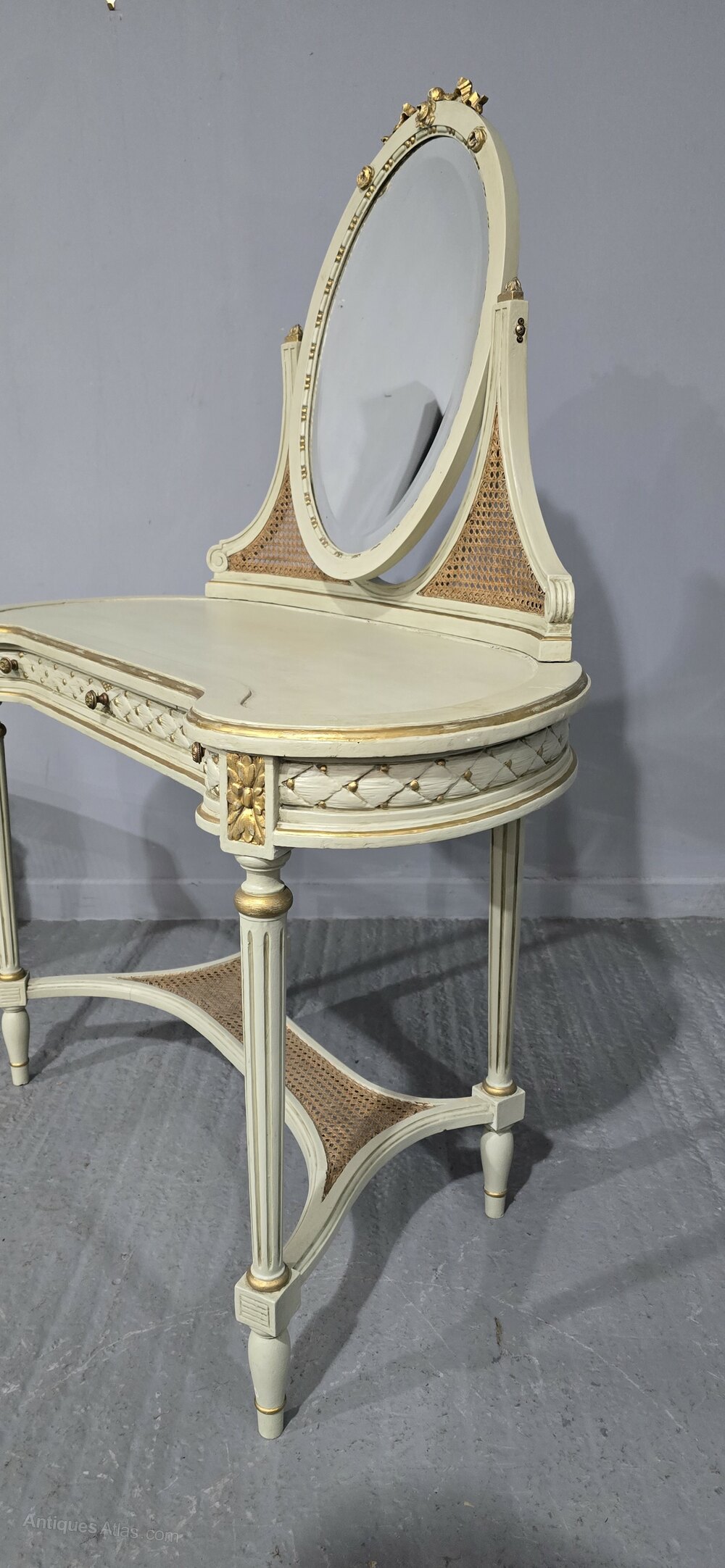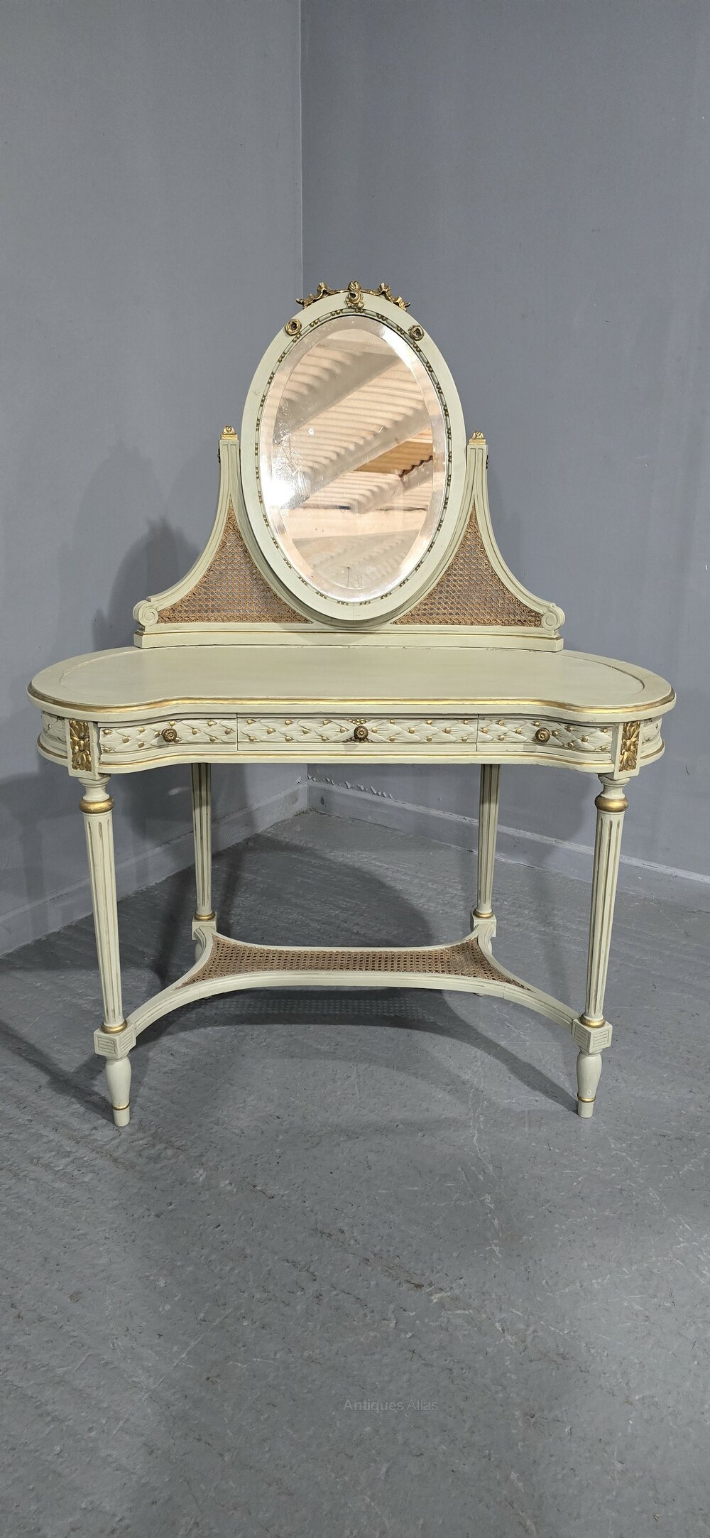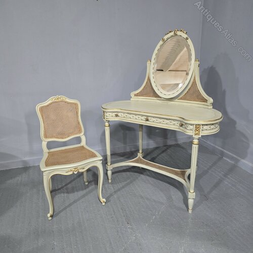 Very pretty French painted kidney shaped dressing table with bergere panels, three drawers and bevelled mirror, with matching bergere chhair, in very good overall condition.