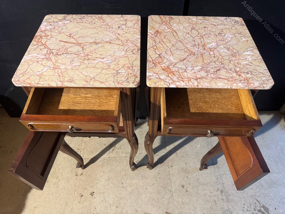 A lovely pair of French Mahogany Bedside Cupboards. Dating to around 1870 and having original variegated mare tops in excellent condition. Each has a cupboard with drawer over and sits on cabriole legs.