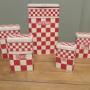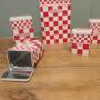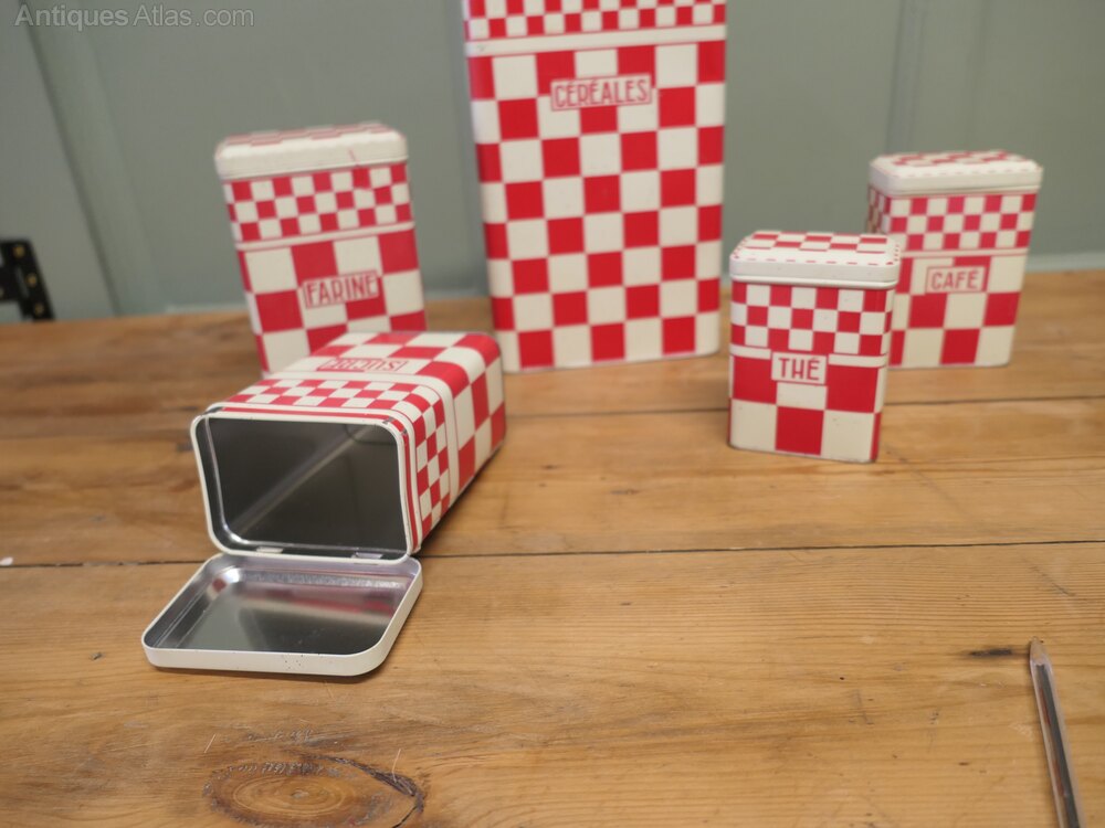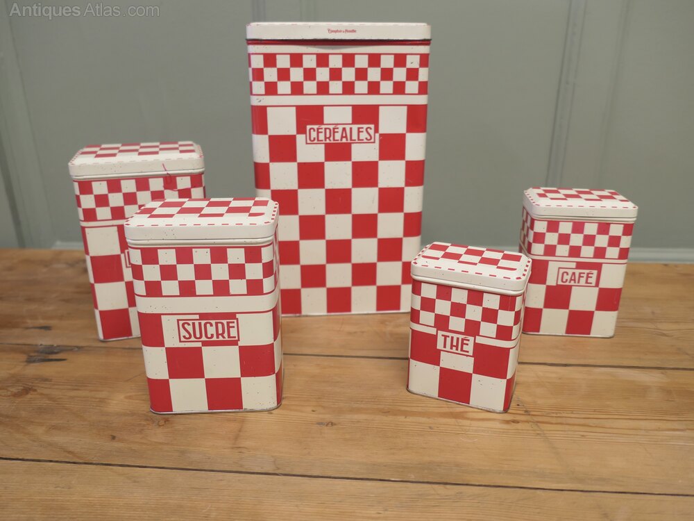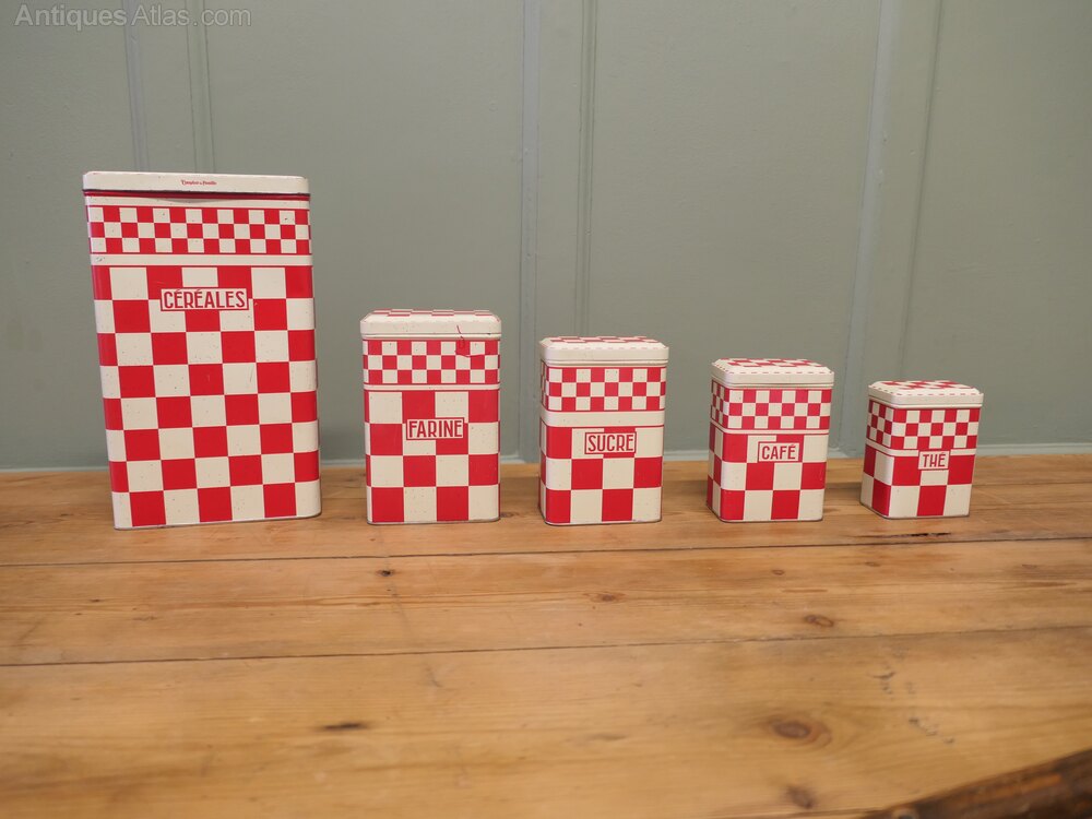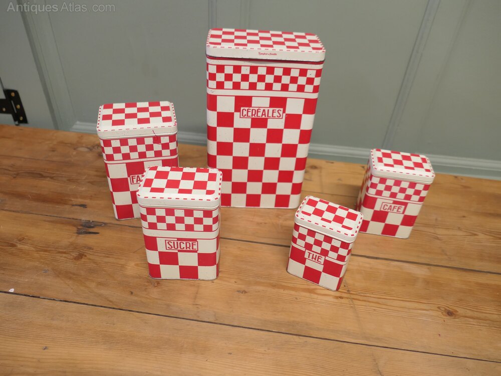 Original French Enamel Canister set is a complete set of five pieces, Sucre, Café, Farine, Thé and Cereals. The canisters are attractively shaped they have a French gingham decoration, they are old but still in fairly good condition