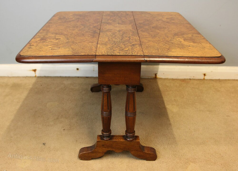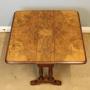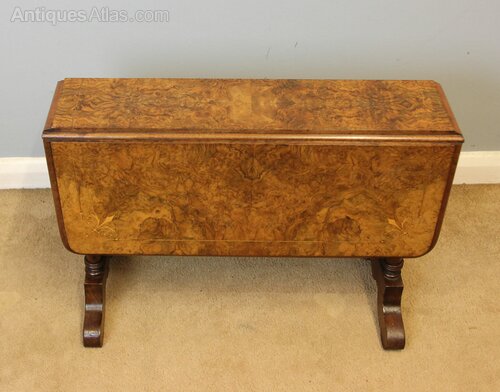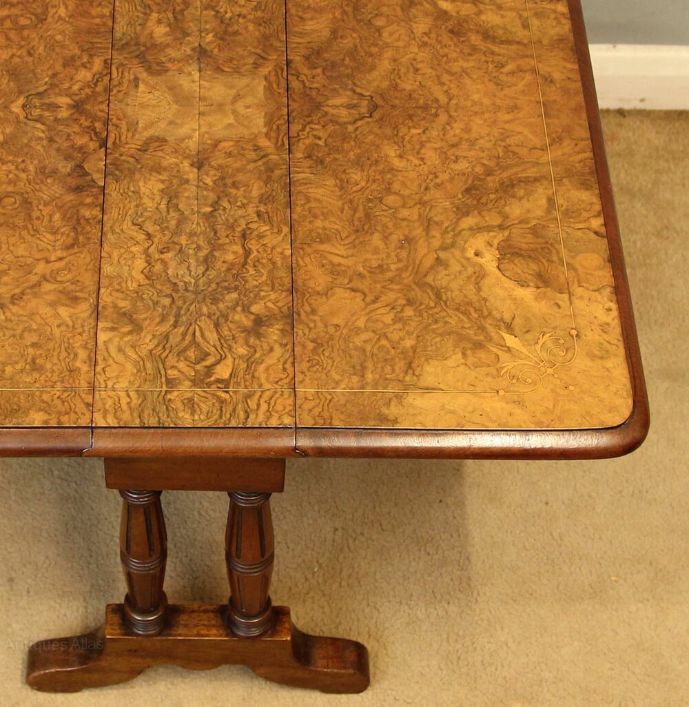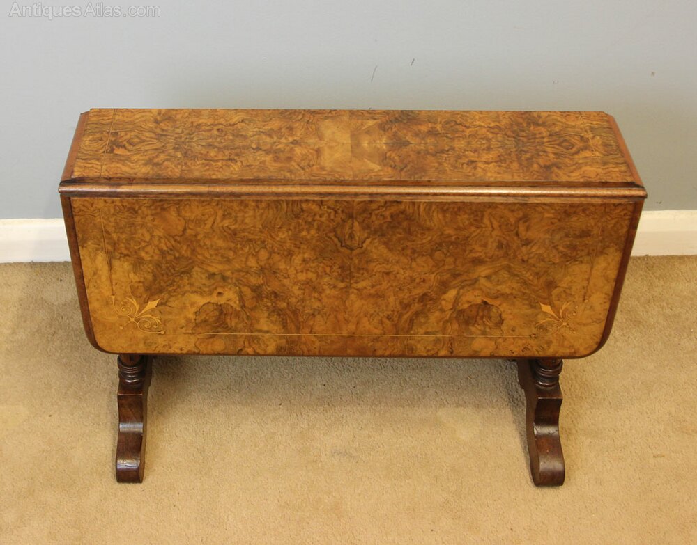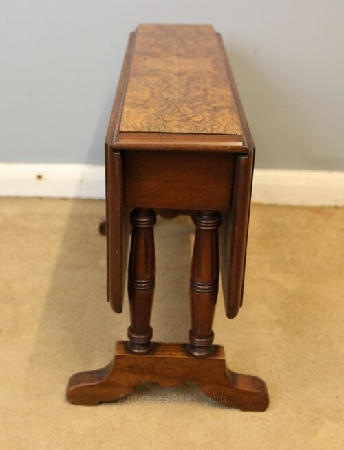 Antique Low Burr Walnut Occasional Sutherland Table, This pretty baby Sutherland style occasional drop leaf table has a wonderful burr walnut top with line inlay to the inner edge and decorative inlay to each corner. All supported by double end turned and reeded supports and shaped feet. This is a very versatile table as can be used with one leaf open or two this beautiful small table would suit any size home.