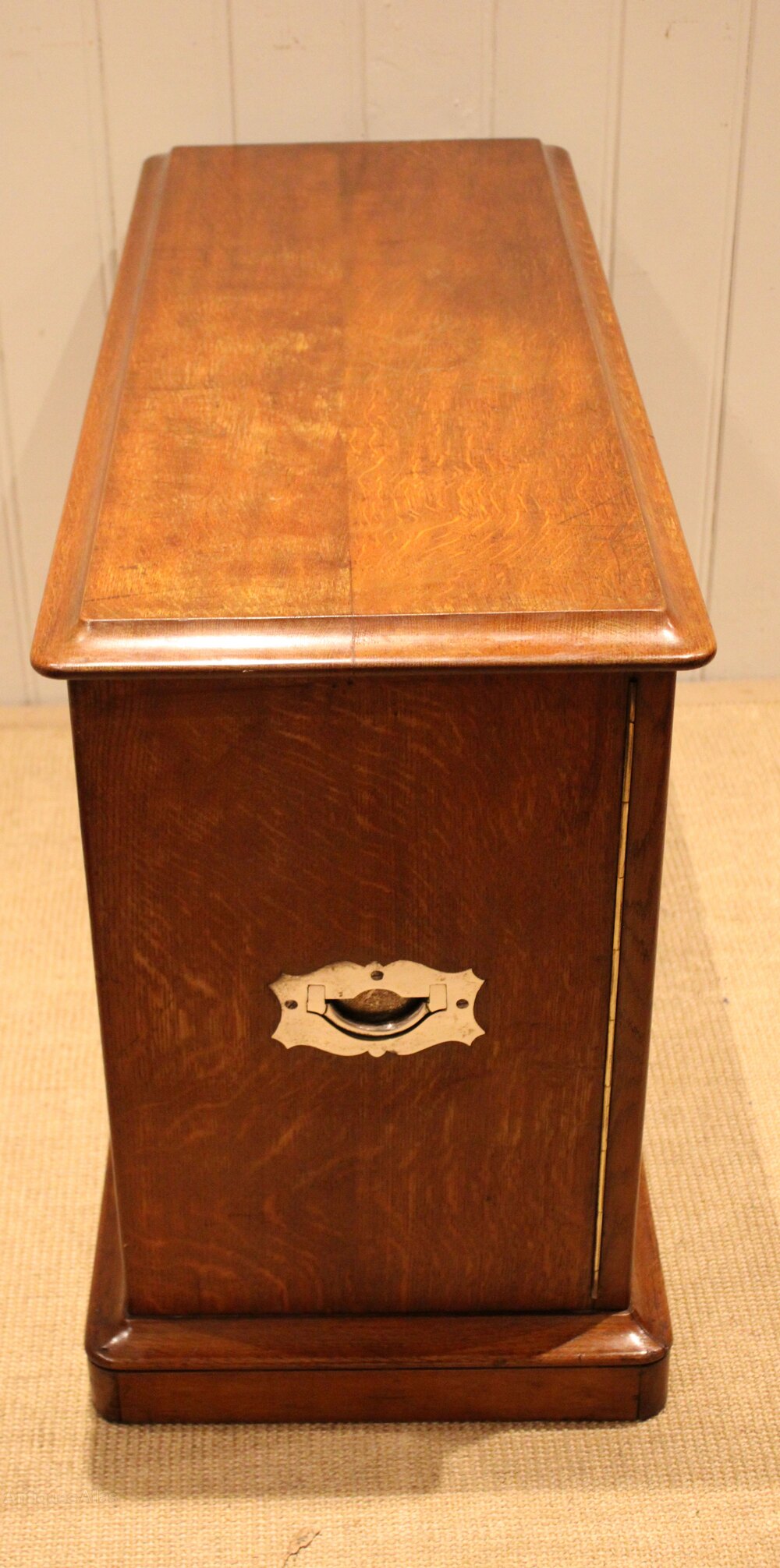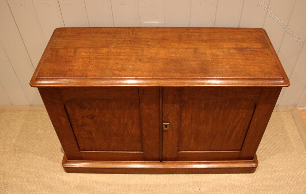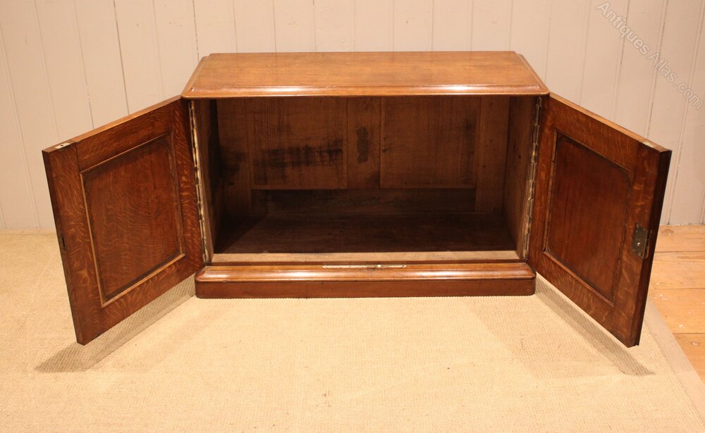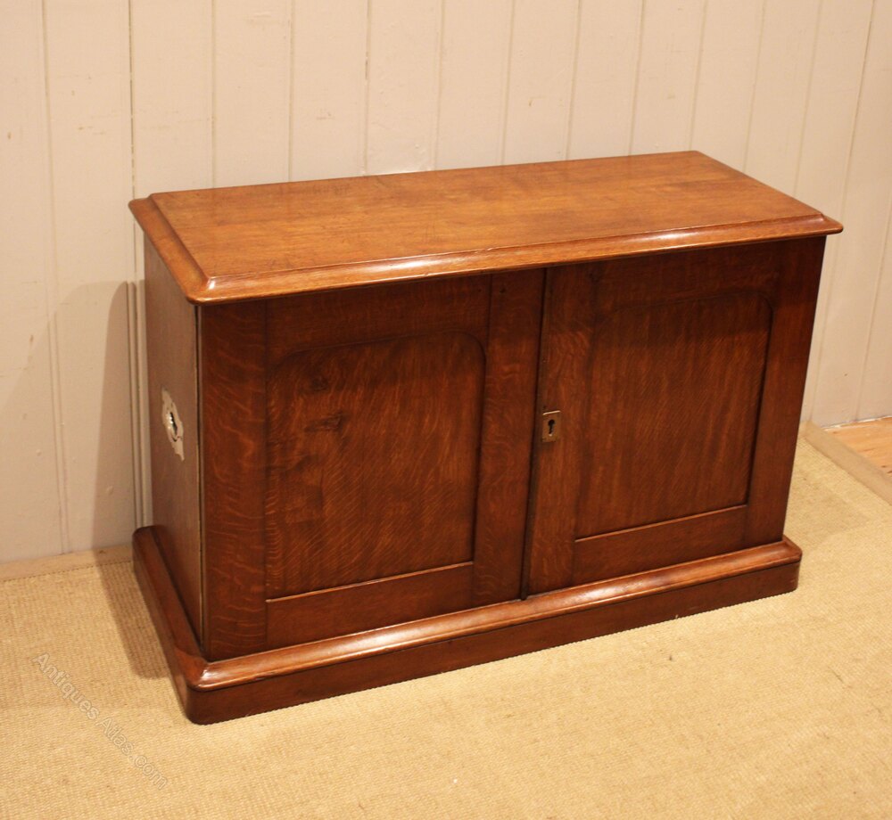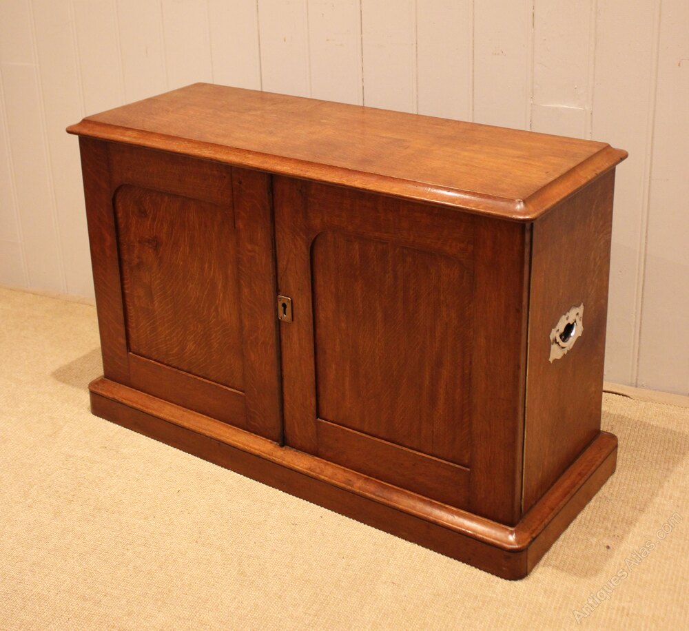 Low golden oak cabinet , having two panelled doors with side handles , raised on a plinth base . Complete with working lock & key .