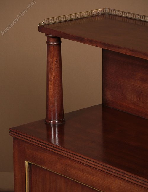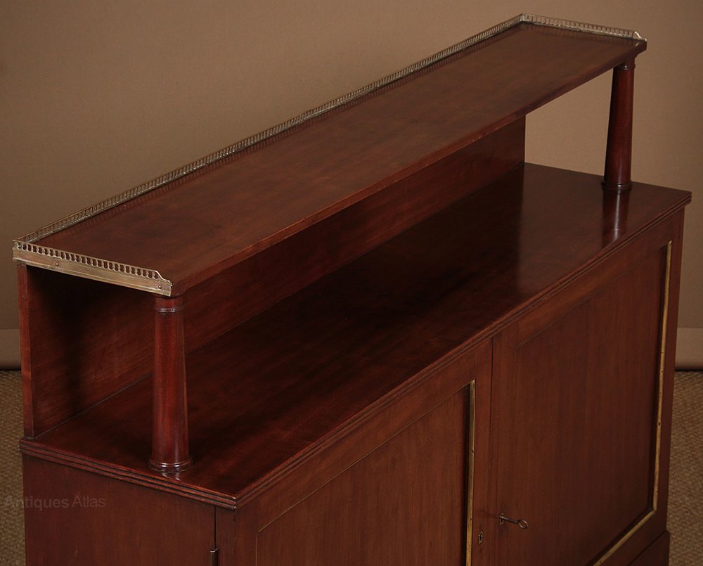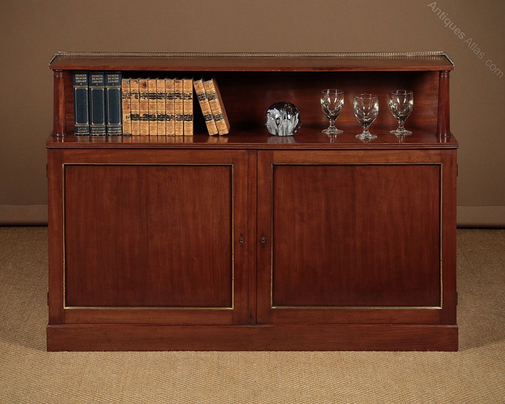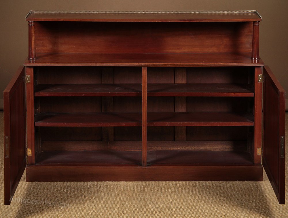 Unusual little Regency style mahogany side cabinet c.1960. A slim shelf with a pierced brass gallery to the sides and rear, raised on elegant turned columns over a two door cupboard fitted inside with two adjustable shelves (internal depth 9″). Reeded edge to the top of the cupboard and polished brass moulding to the door panels. Excellent condition, cleaned and waxed in our workshops. Key supplied.