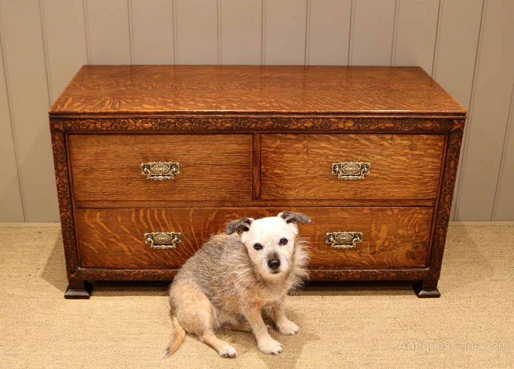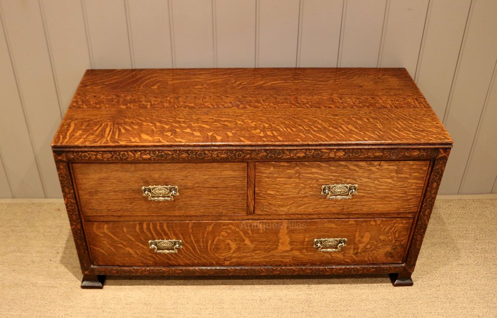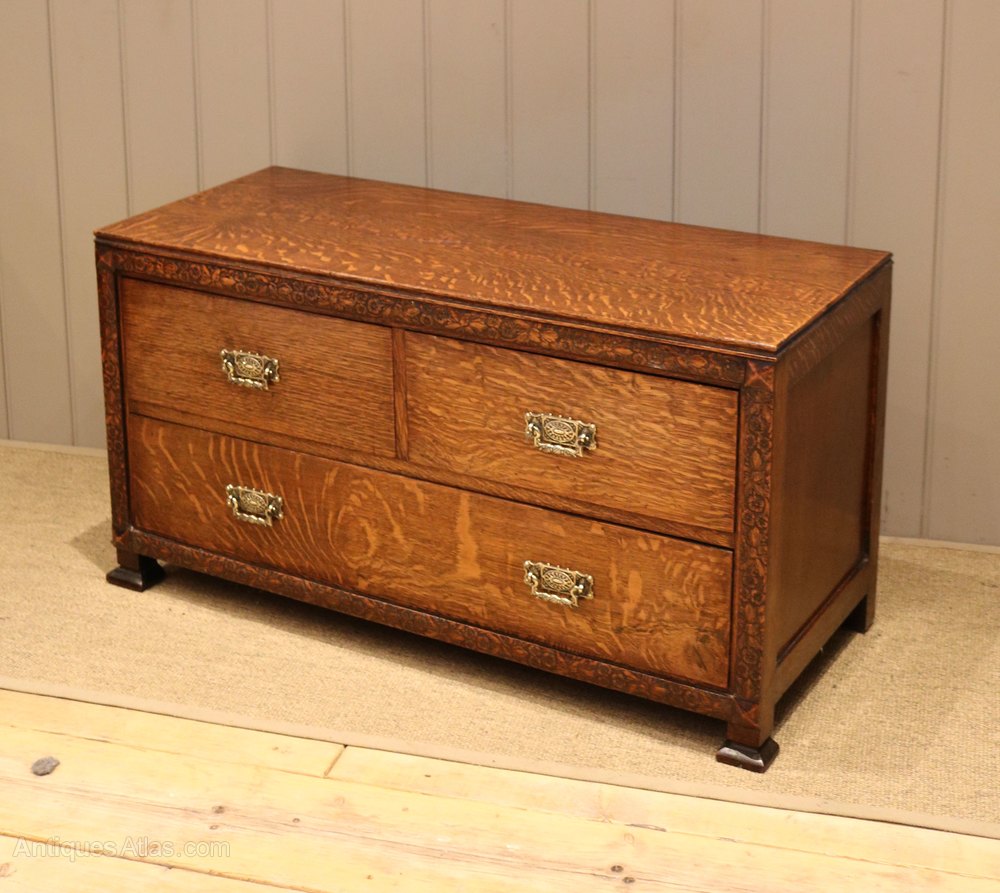 Low oak chest of drawers having two short and two long drawers , with an attractive floral carved edge , raised on shaped feet. A really useful piece of antique furniture , would be great at the end of a bed ,or for a television