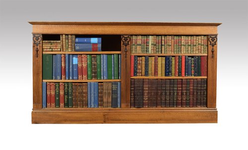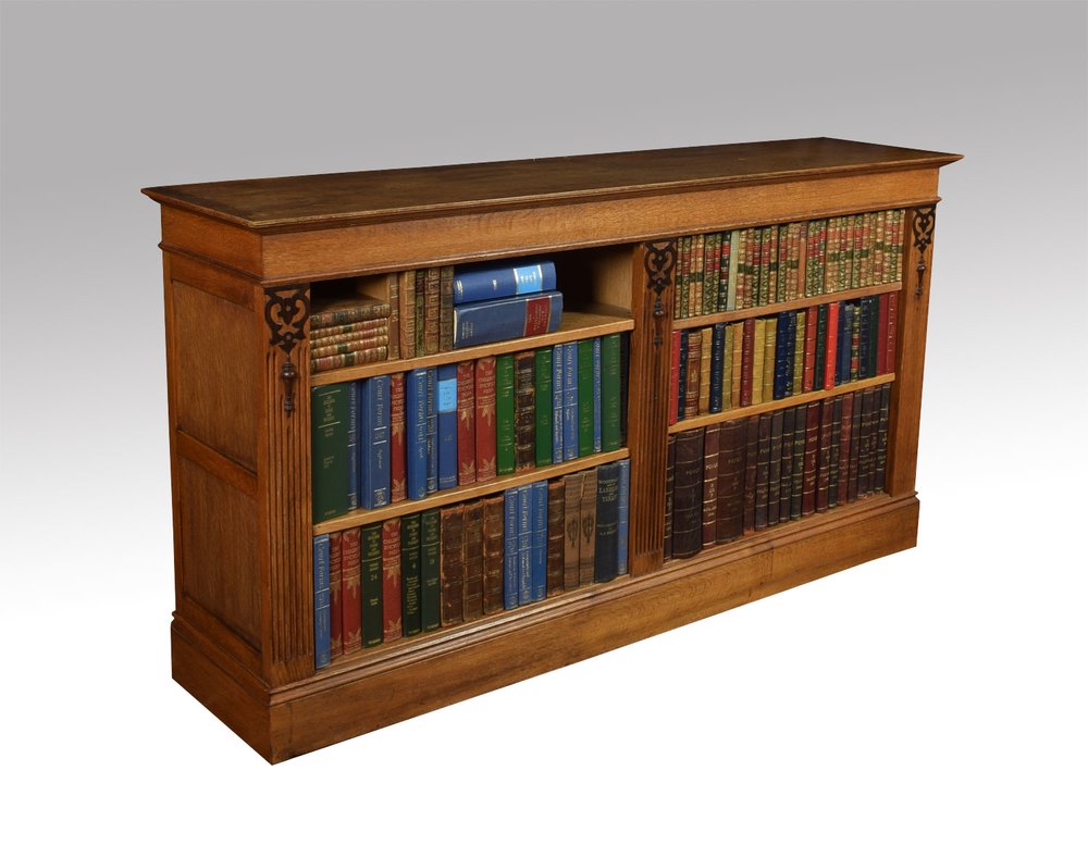 large oak open bookcase the large rectangular top above two sections of adjustable shelving flanked by carved reeded columns all raised up on plinth base