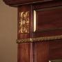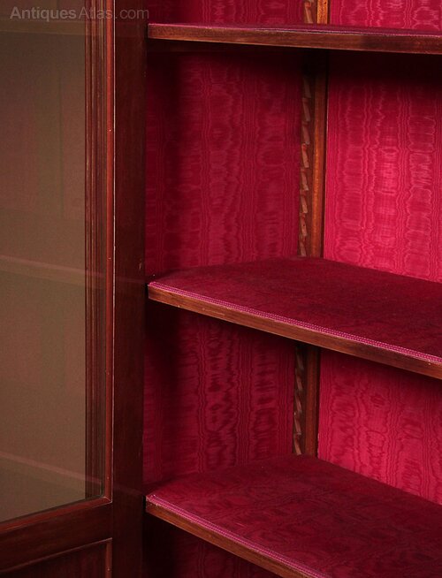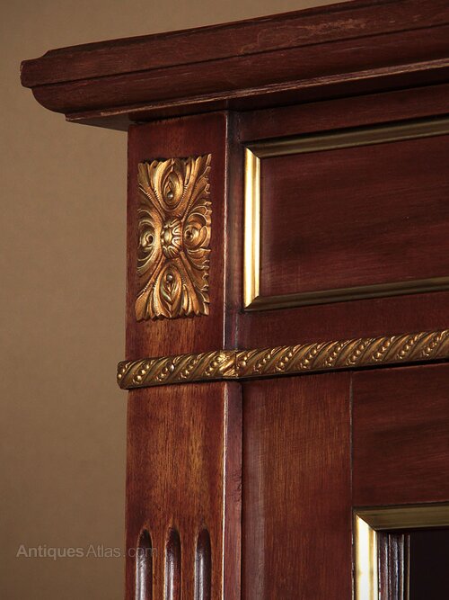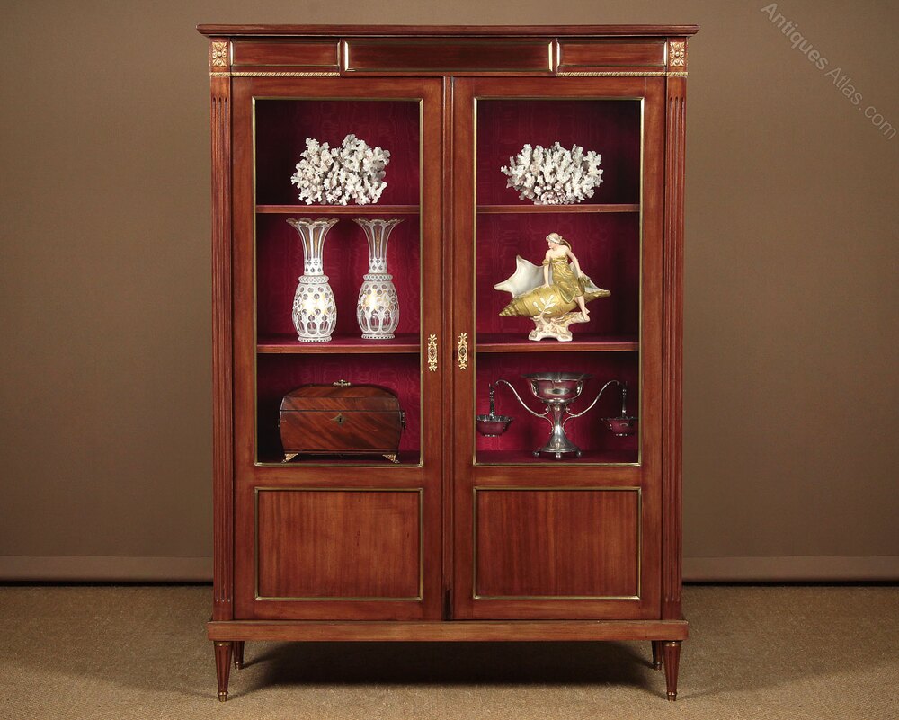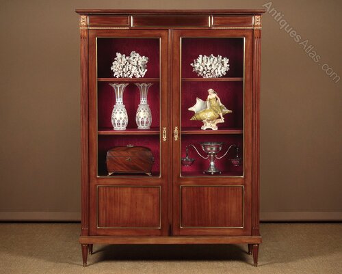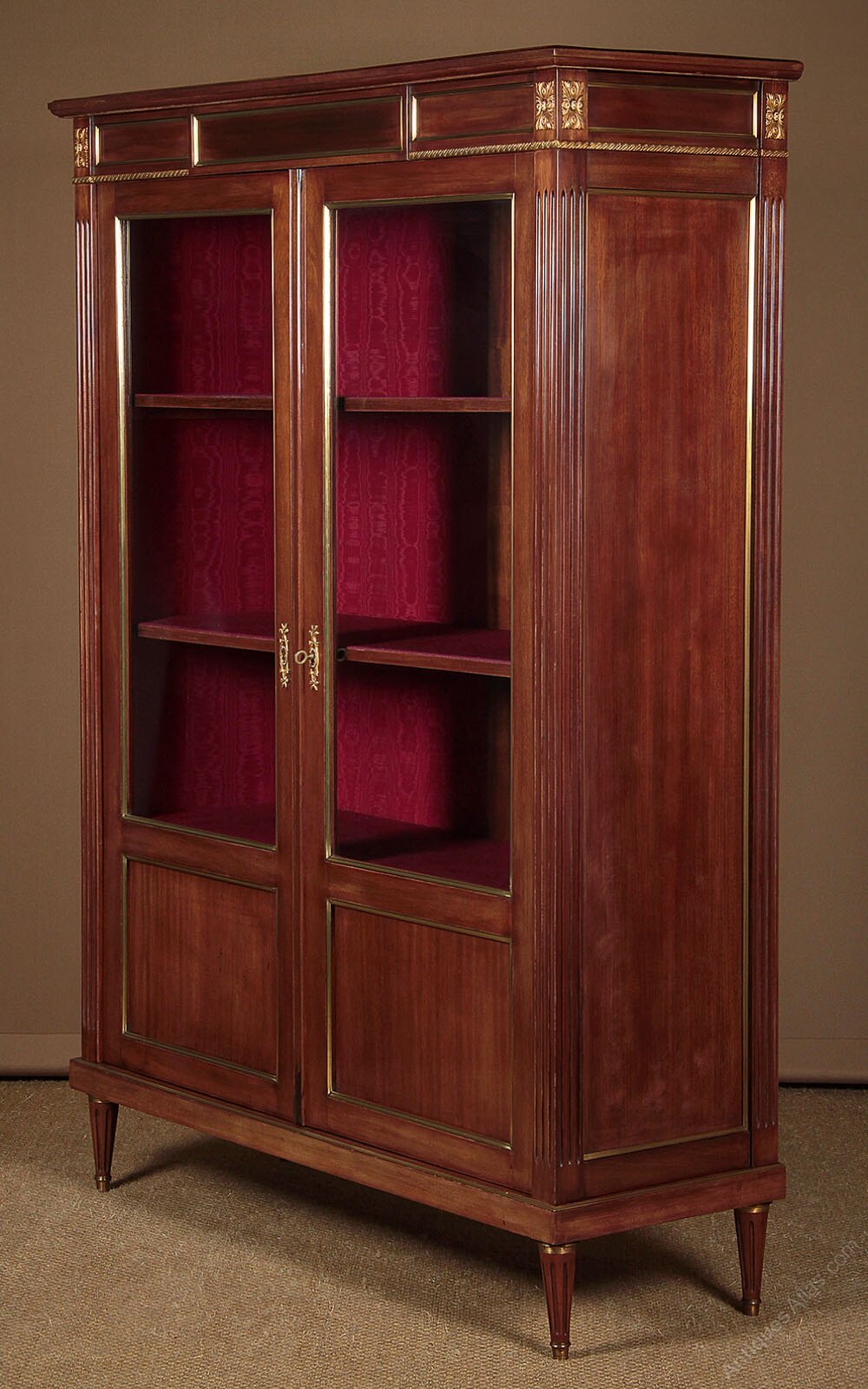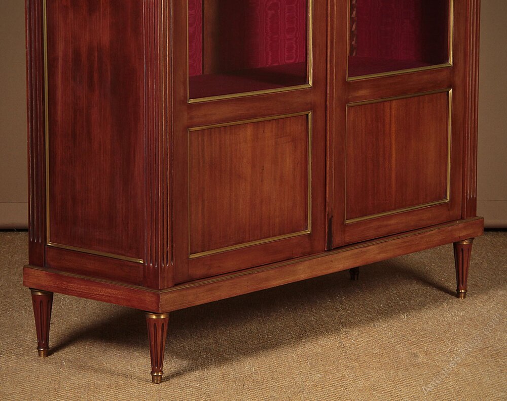 Mahogany and brass mounted vitrine or display cabinet c.1930. Two glazed doors with blind panels below, fitted inside with three adjustable shelves (internal depth 13″). Extensive brass mouldings to the front and sides plus acanthus leaf mounts at the corners of the cornice and decorative escutcheons. Fluted uprights at the front and sides and raised on short turned and fluted legs, also brass mounted. Original rich red moire lining fabric. Very good condition, cleaned and waxed in our workshops. Note this cabinet can be disassembled for delivery.