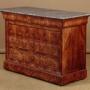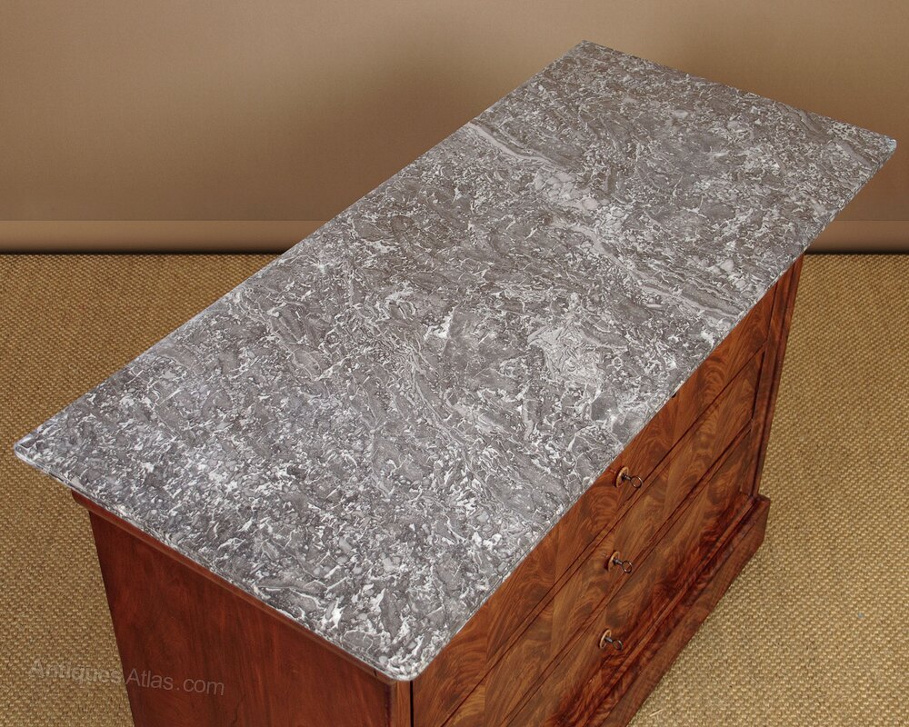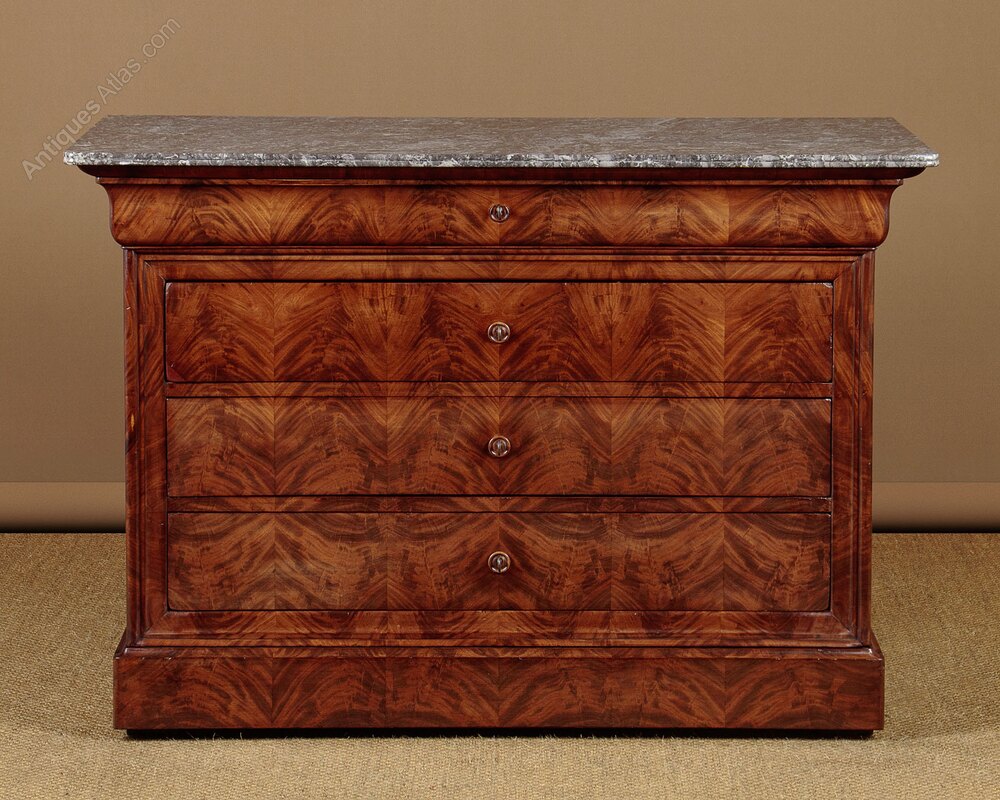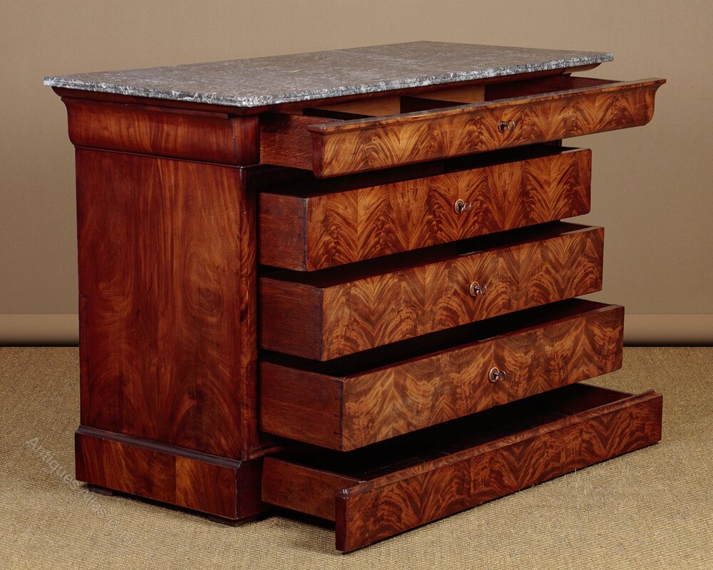 Handsome mid 19th.c. French mahogany and marble top commode or chest of drawers c.1860. Well figured grey marble top with rounded corners and a moulded edge over a chest of four long drawers plus an extra drawer hidden in the plinth. Flame mahogany veneers arranged in a symmetrical pattern across the front of the chest. Shallow top drawer with a shaped front continued on the sides of the cabinet and internal dividers. The three deeper drawers set within a moulded surround, each with a turned escutcheon. Sides veneered to match and raised on a moulded plinth with a slim drawer within. Excellent colour and condition, cleaned and waxed in our workshops. Keys supplied.