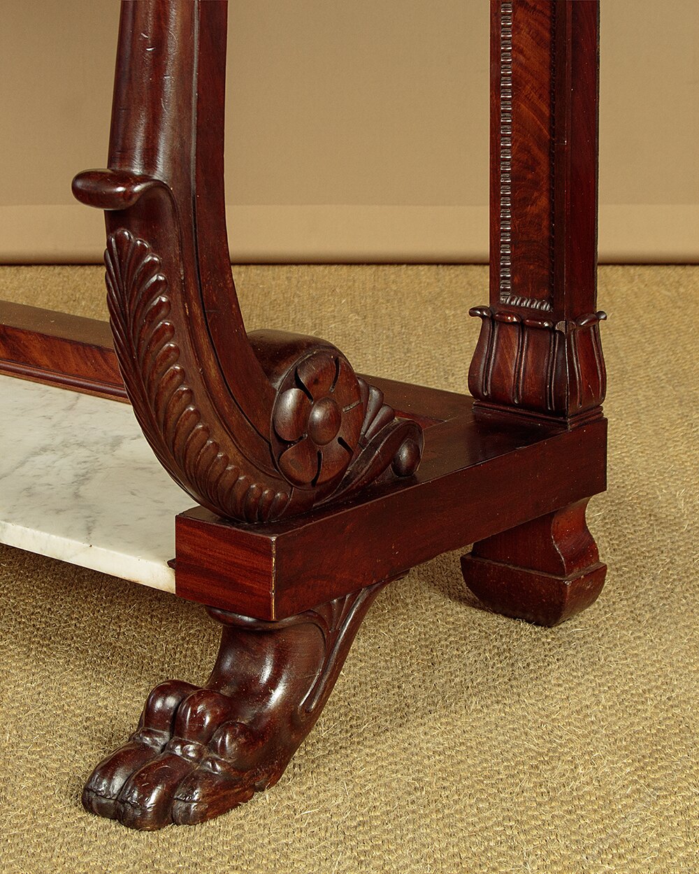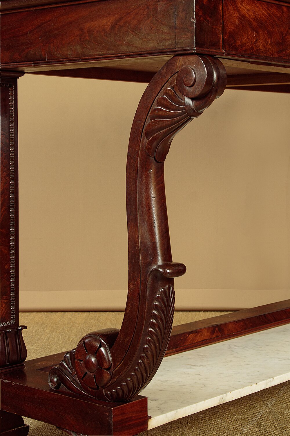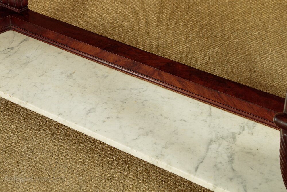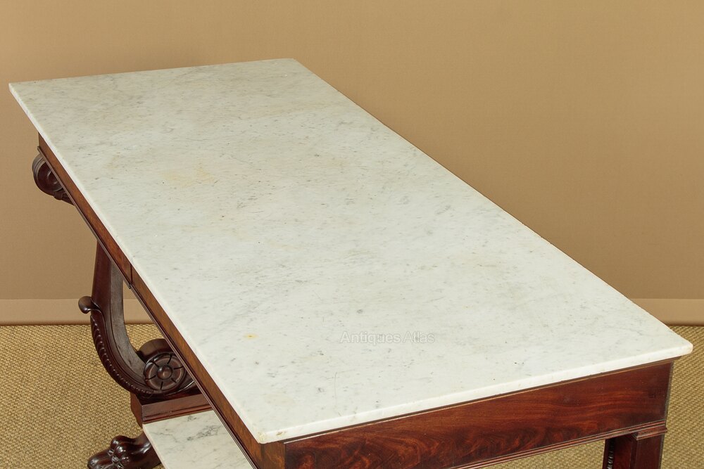 Large mid 19th.c. mahogany and marble console table c.1840. White Carrara marble top on a mahogany base with two drawers and (unusually) a second marble shelf below. Symmetrically arranged flame mahogany veneers to the drawer fronts and continued on the sides of the table. Fabulous S shape front supports in solid mahogany with crisp Regency style carved detail. Straight rear supports, flame mahogany veneered and moulded with a carved detail at the base. Raised mahogany veneered curb to the sides and rear of the lower shelf. Raised on large carved claw feet. Mahogany drawer linings. Excellent colour and condition with some minor repairs. Cleaned and waxed in our workshops.