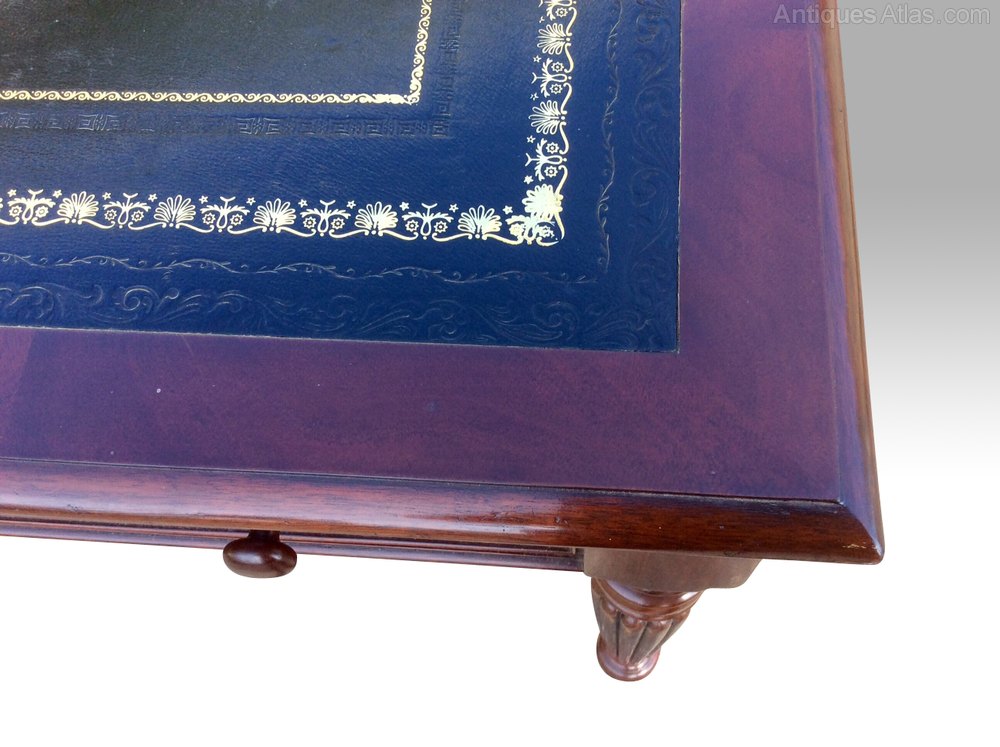 Fine Quality Early Victorian Mahogany Antique Libary Table With Tooled Blue Leather Hide[Two Drawers Each Side}.