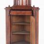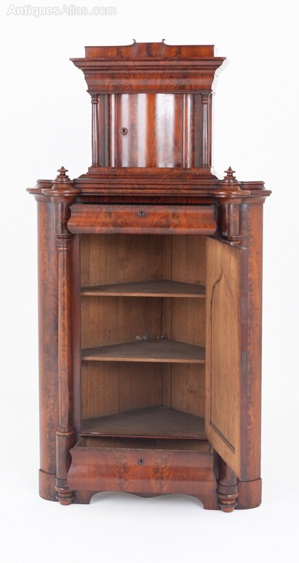A wonderful Biedermeier corner cabinet crafted from beautifully figured flame mahogany. The lower section features a central door with Arch detail, elegantly flanked by turned columns, with a shaped drawer positioned both above and below the door.