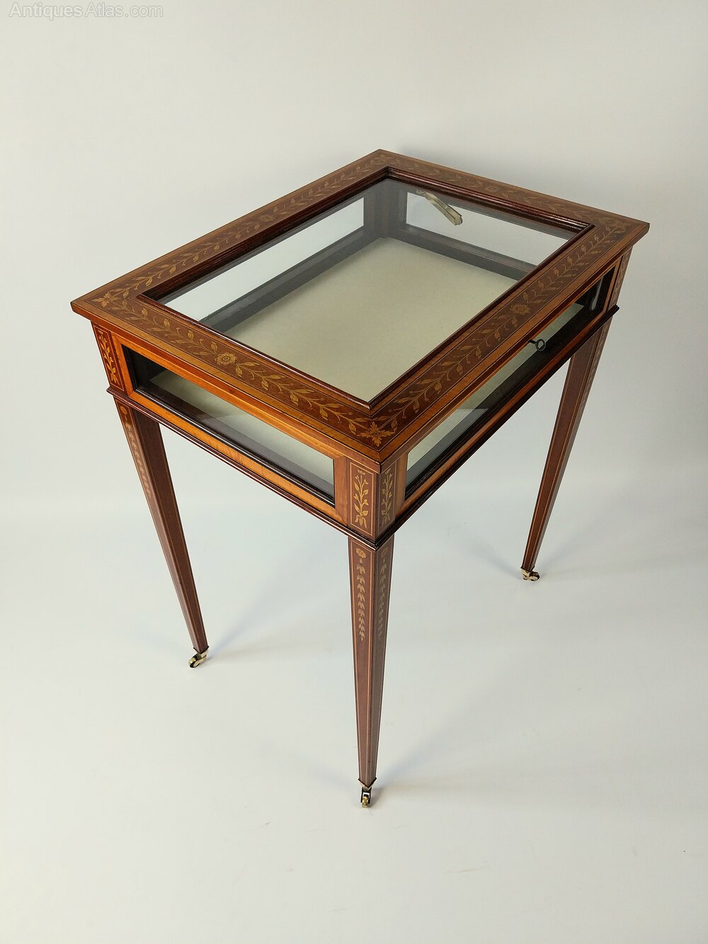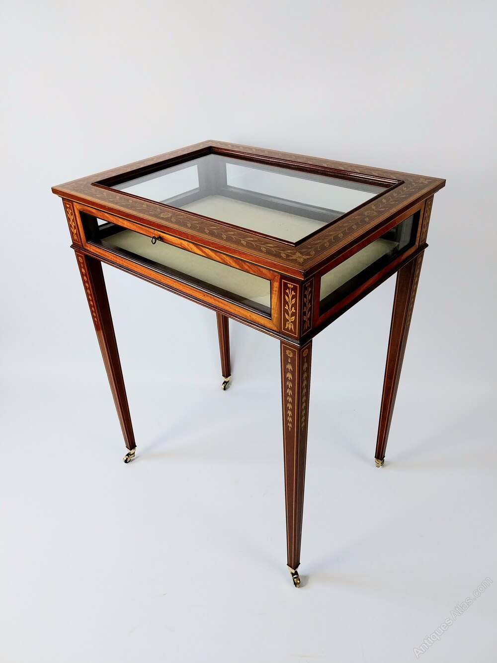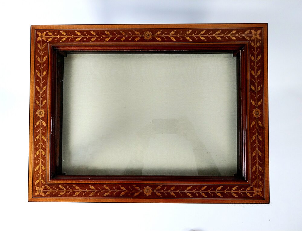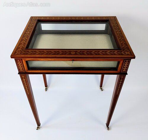 An extremely good quality Mahogany Bijouterie Display Table Cabinet with very fine floral inlaid top which is surrounded with a broad Satinwood edge and fine line detail, the tapering legs are also nicely inlaid with Harebells and line inlay and are finished with brass castors. This Bijouterie Table benefits from glazed sides the interior is lined with cream fabric and the lid can be held open with the hinged brass stay to the right.