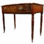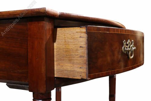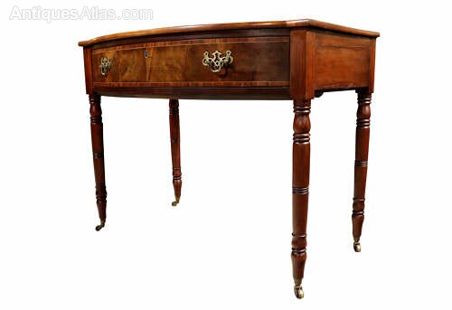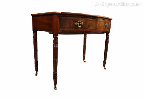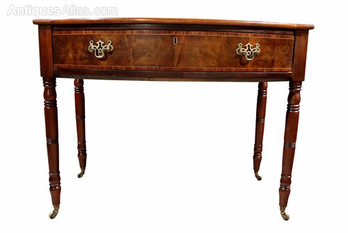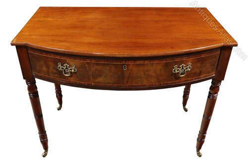 The table features a well-figured bow-fronted drawer, fitted with original style brass handles and a central lock, framed by fine boxwood line inlay. It is raised on turned mahogany legs terminating in brass caps and castors, giving both elegance and practicality.