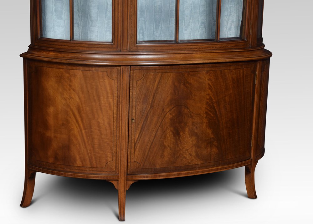 Early 20th century mahogany bow fronted display cabinet, having moulded cornice, above large glazed door opening to reveal watermark silk upholstered interior with three glazed shelves. The base section fitted with cupboard door. All raised up on splayed legs