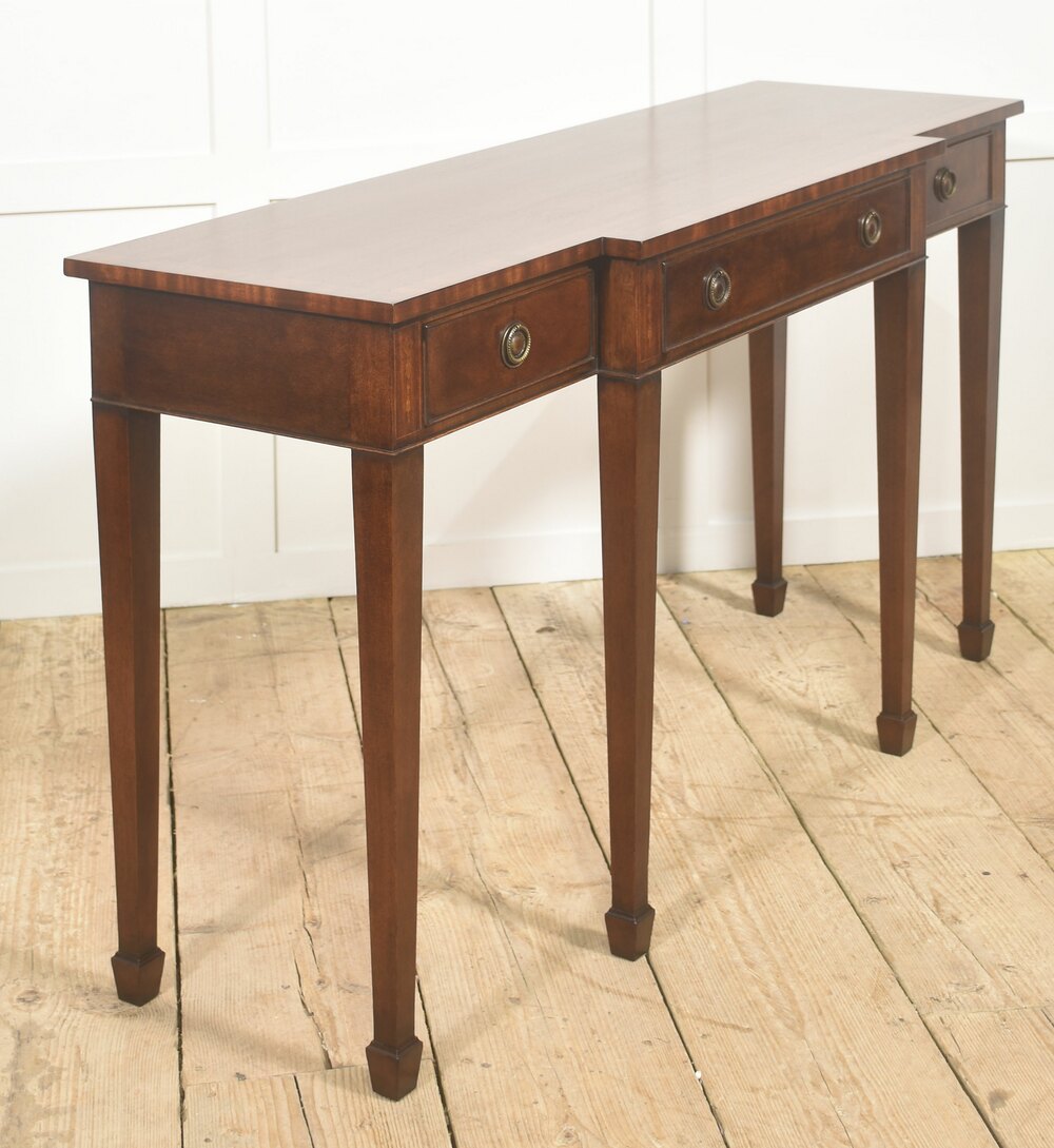 A finely proportioned mahogany side table of refined classical inspiration, the rectangular top subtly stepped at the center to create a gentle breakfront outline. The top is beautifully figured, displaying a rich, warm brown tone with lively ribbon stripe and subtle flame figuring across the surface and edge banding. The crisp, clean lines of the moulded top sit above a shallow frieze fitted with three drawers arranged in a symmetrical configuration, the longer central drawer flanked by two smaller drawers to either side.