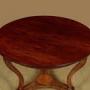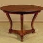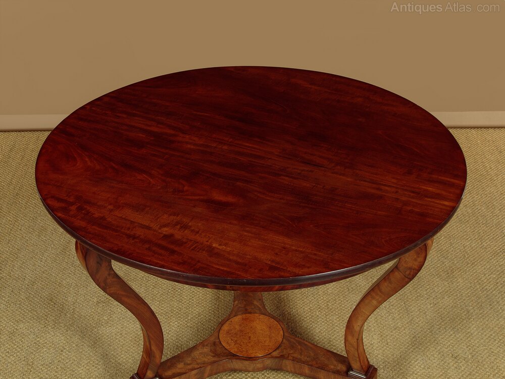 Very elegant French mahogany centre table c.1860. 44½" diameter top made from two solid mahogany boards. Over a shallow mahogany veneered apron with oak groundwork. Raised on three swept and tapering legs with amboyna burr veneered roundels at the tops. Joined with a tricorn plinth stretcher, veneered to match and also with oak groundwork, raised on moulded feet. Excellent colour and condition, cleaned and waxed in our workshops.