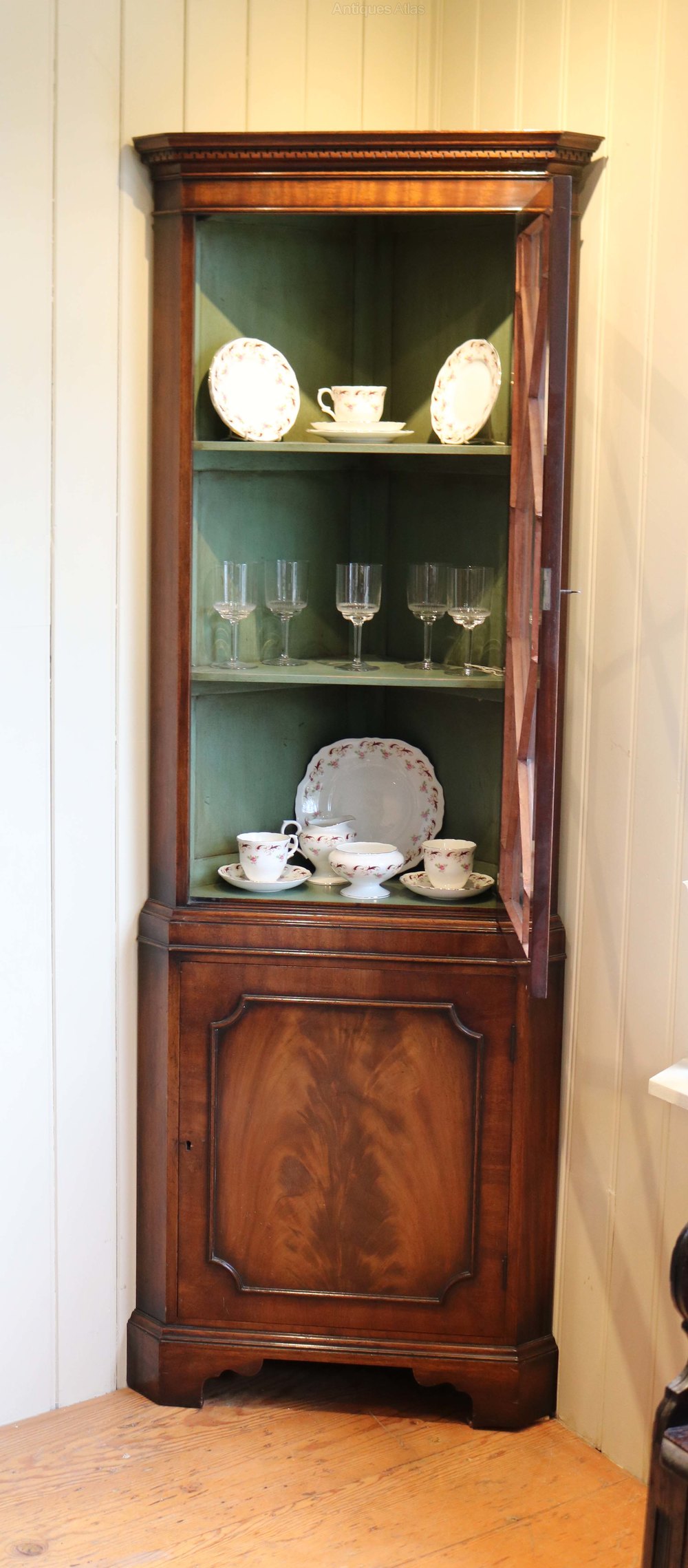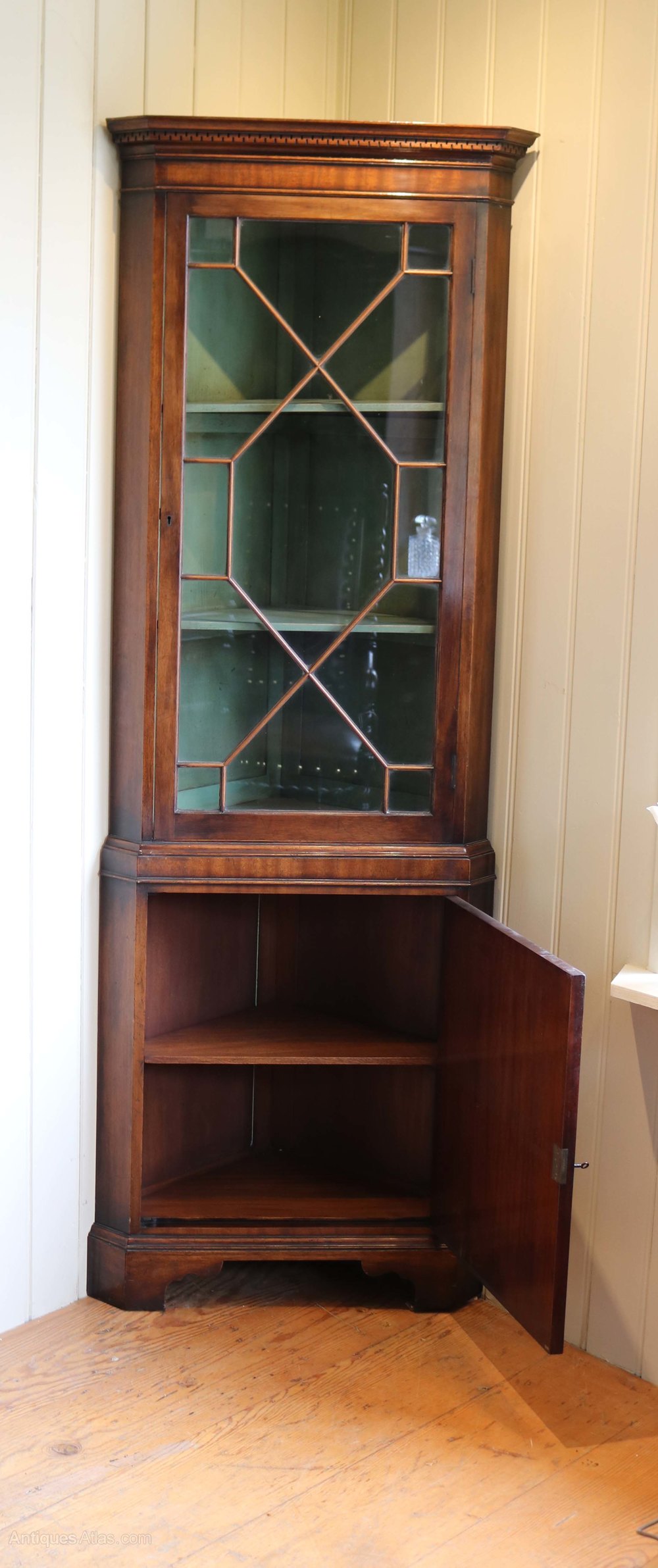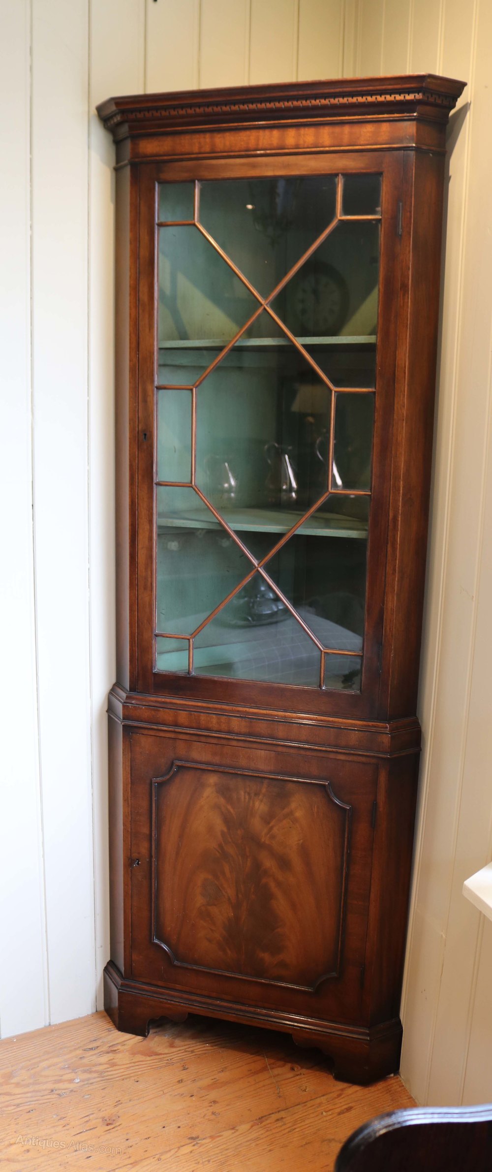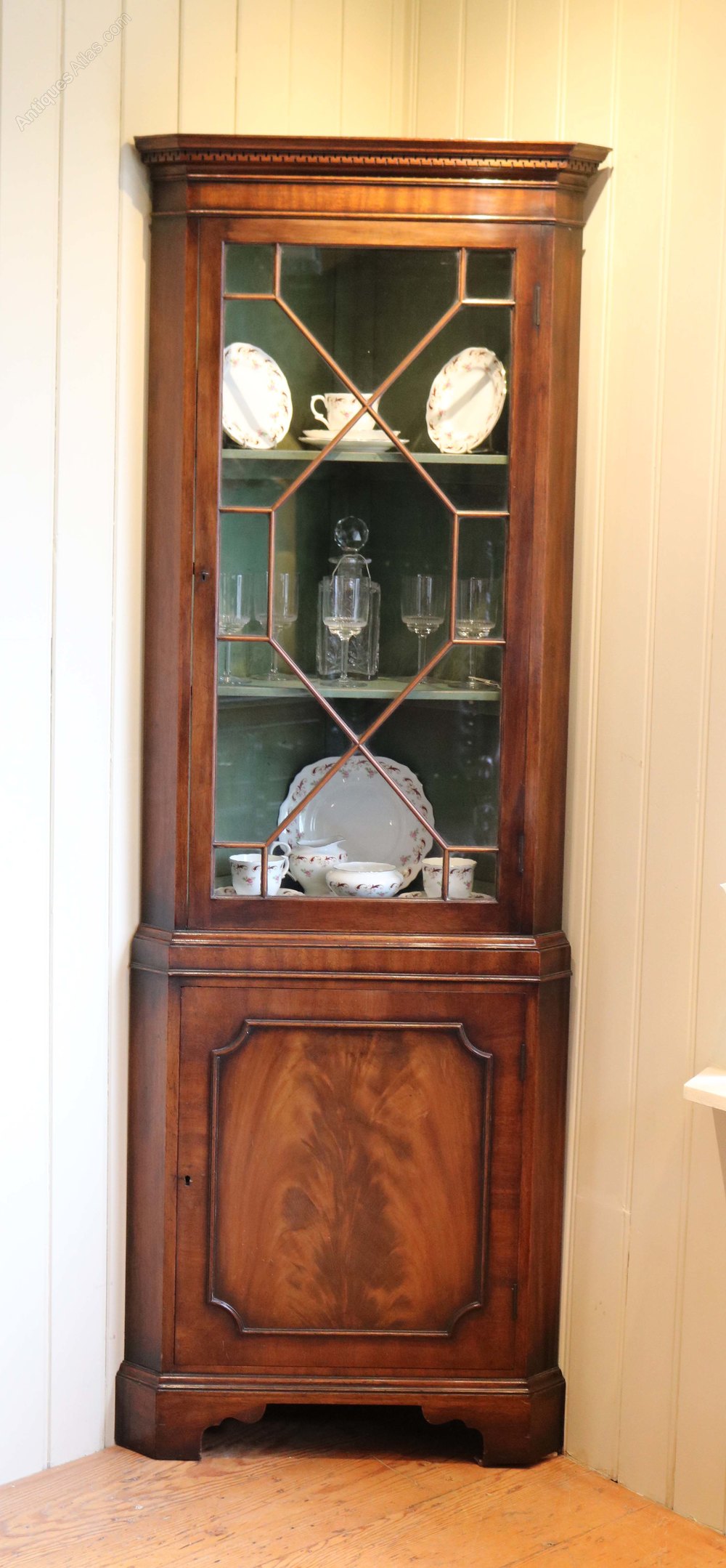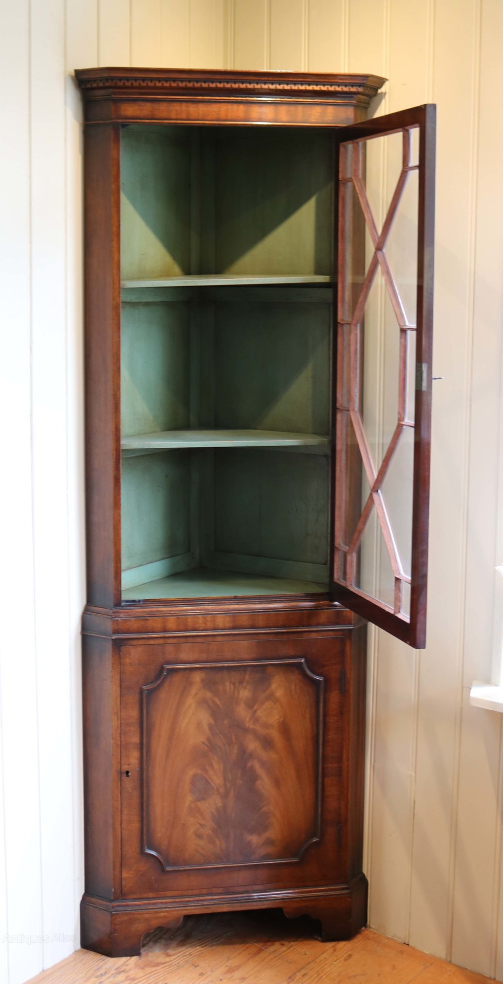 Good quality mahogany corner cabinet having an astragal glazed top with two fixed internal shelves above a cupboard base raised on bracket feet.Made by G T Rackstraw of Worcester