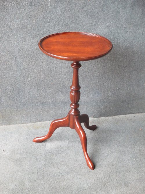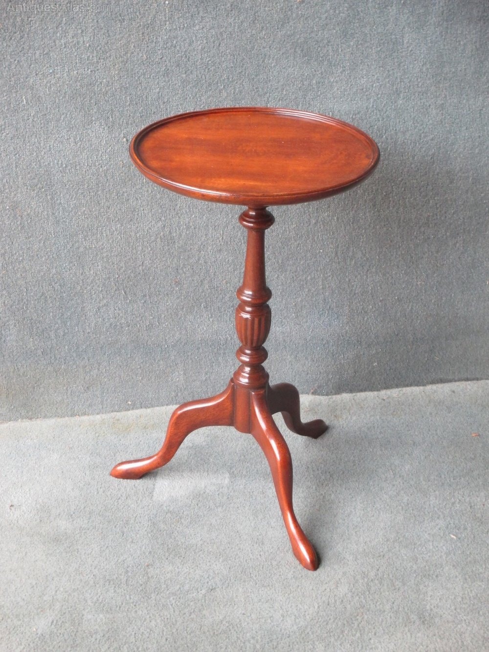 A useful little mahogany dish top tripod wine table. The centre column is turned with a carved reeded vase. The swept down legs terminate in pad feet.