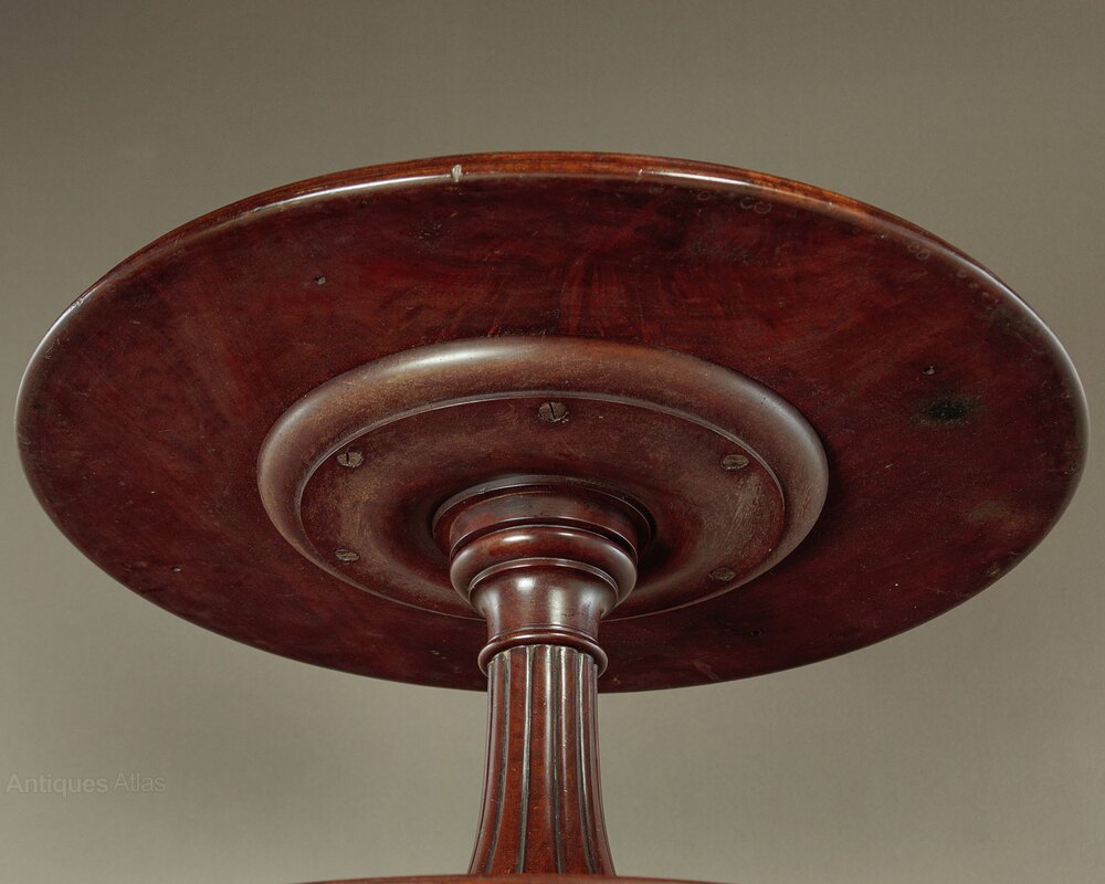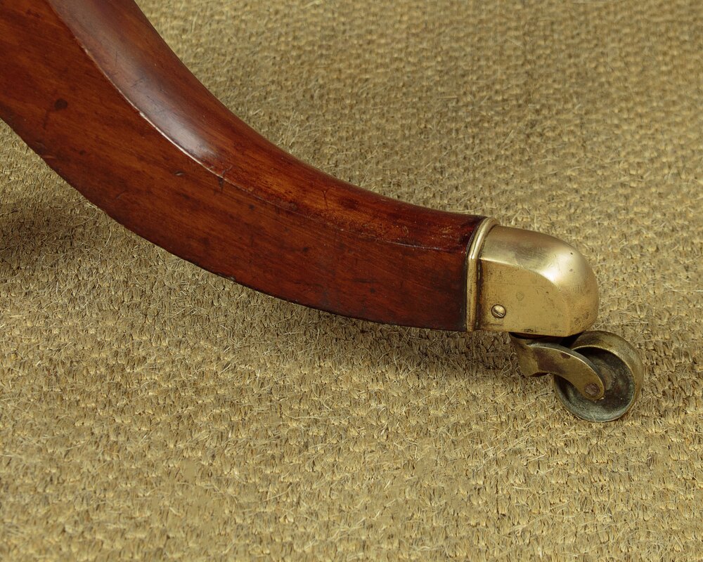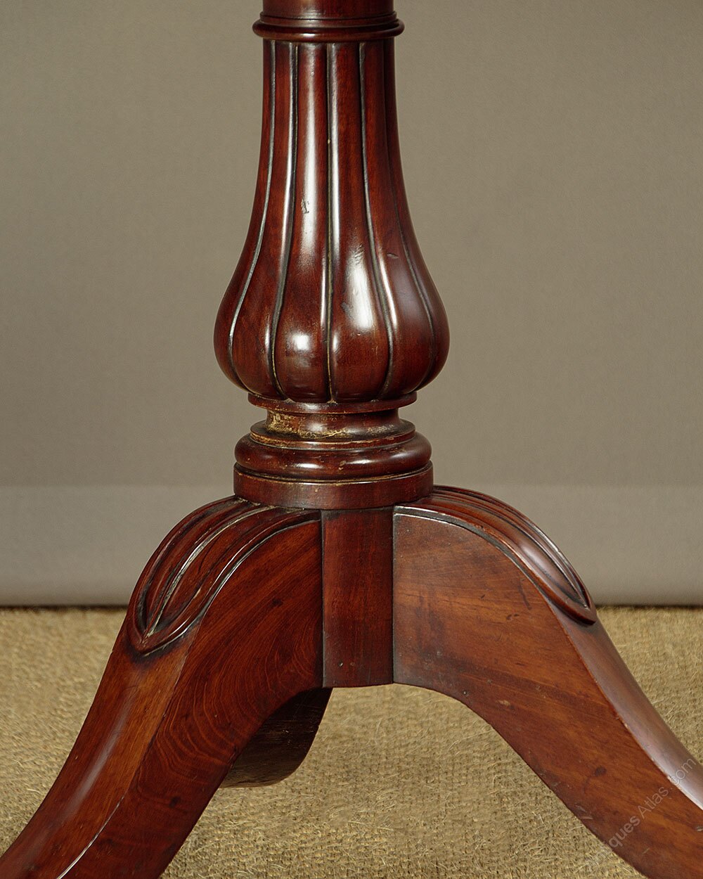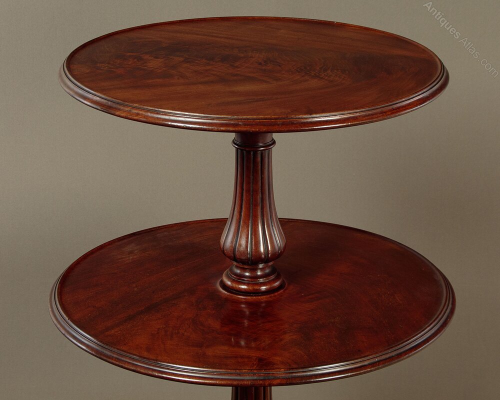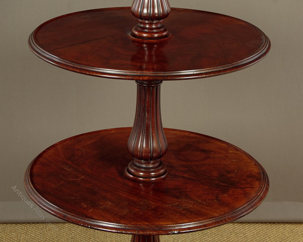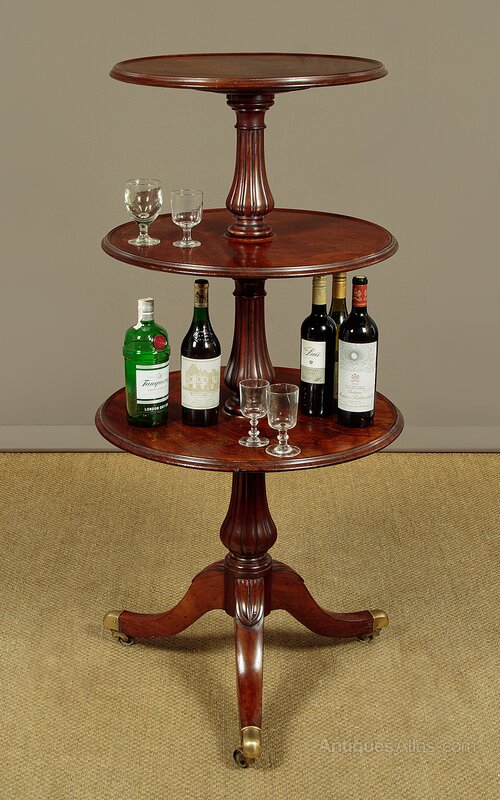Superb quality William IV mahogany dumb waiter c.1835. Three revolving tiers of graduated size (22"/24/"26" diameter) in very well figured solid mahogany with raised and moulded edges. On a bulbous reeded column and tripod base. Swept legs with carved papyrus leaf detail and original large brass toes and castors. Excellent colour and condition, cleaned and waxed in our workshops.