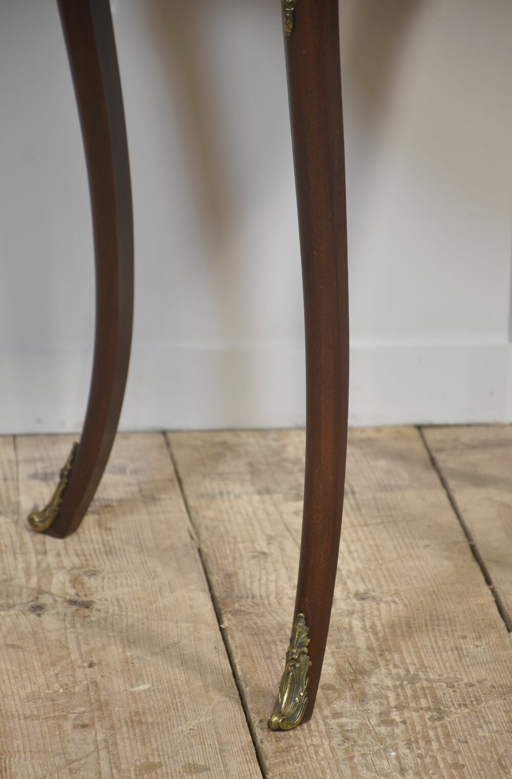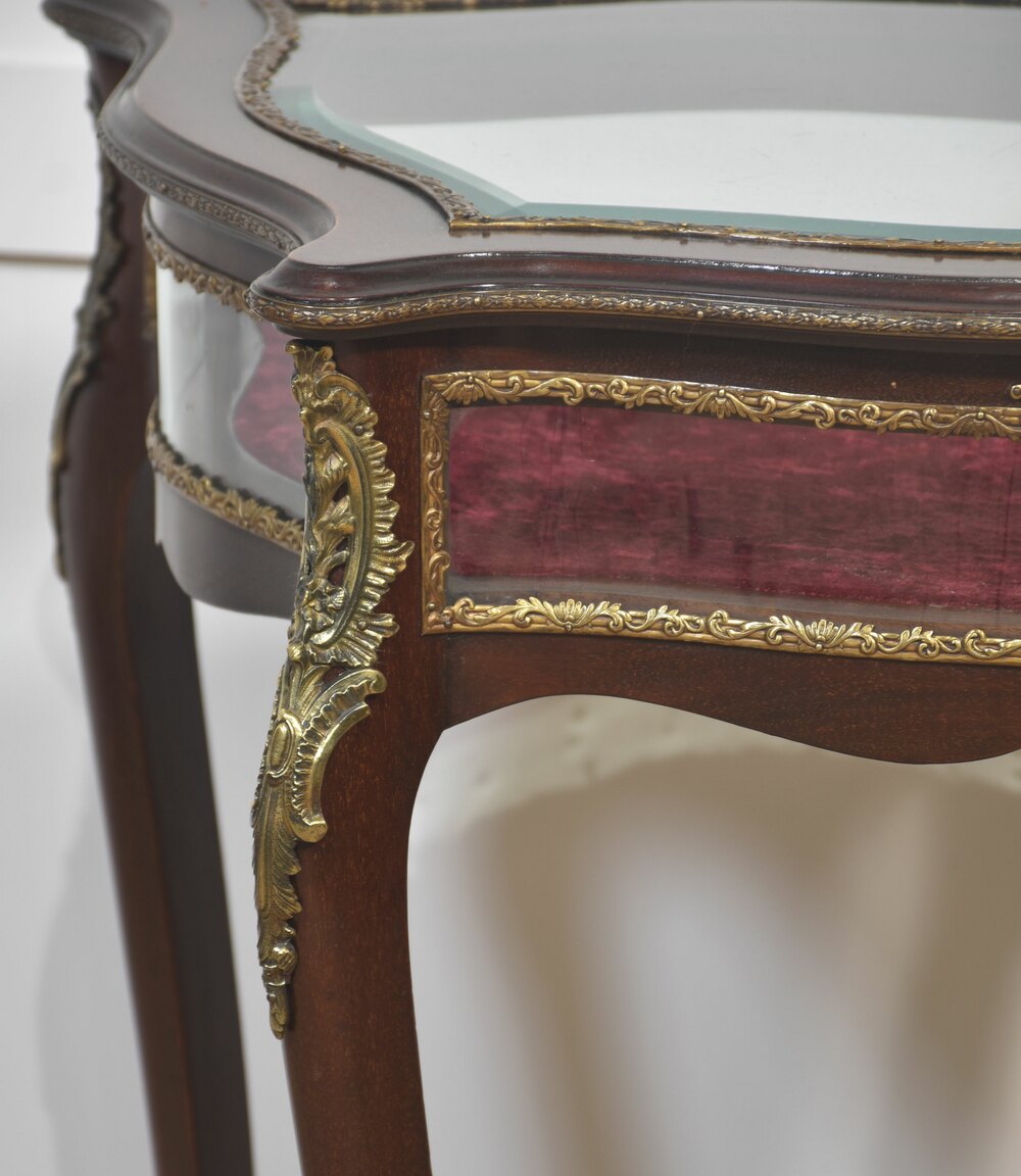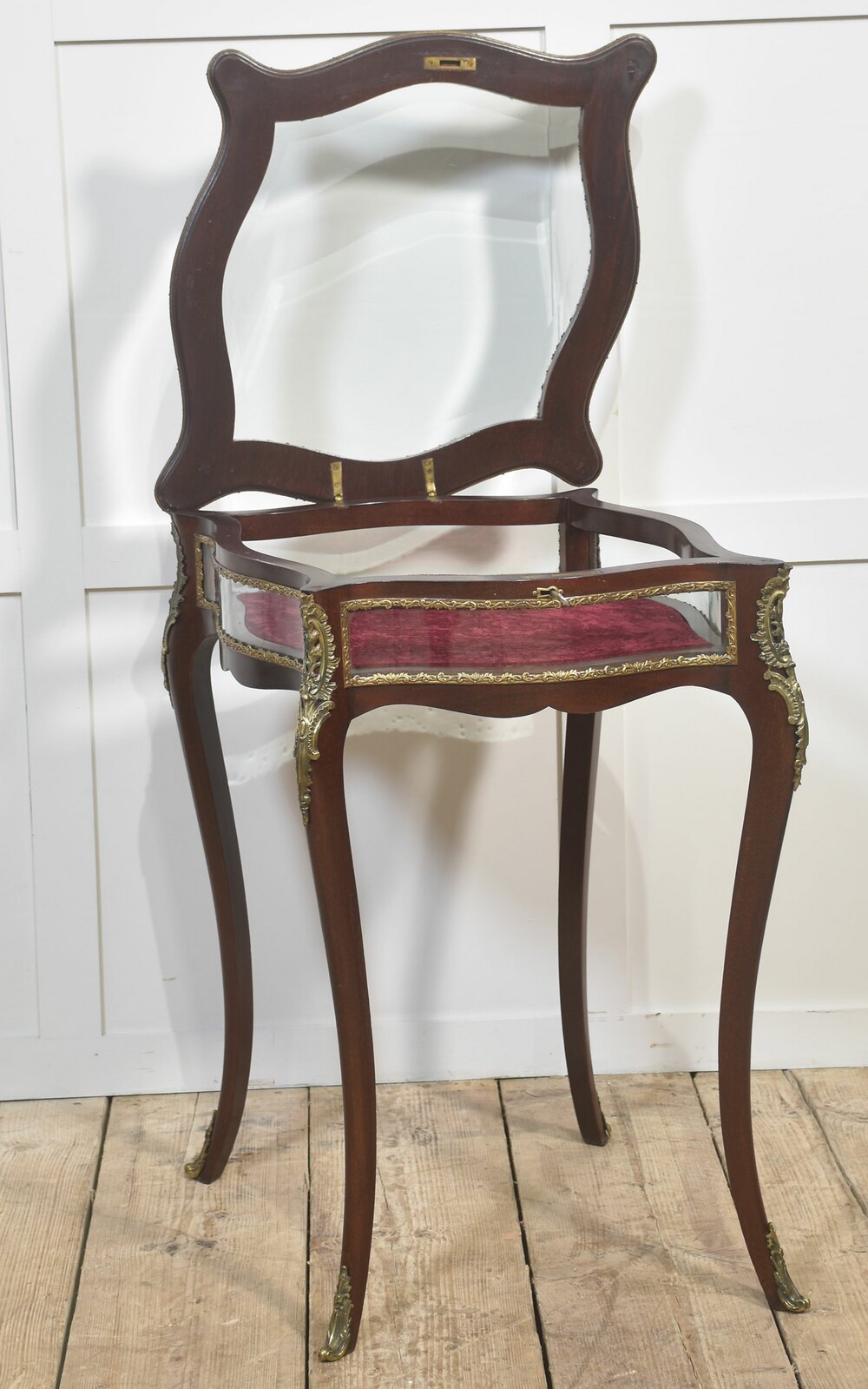A refined French bijouterie table in the Louis XV style, beautifully crafted from mahogany and embellished with ornate gilt metal mounts. The shaped glazed top lifts to reveal a plush red velvet-lined interior, perfect for displaying jewellery, small treasures, or personal keepsakes.