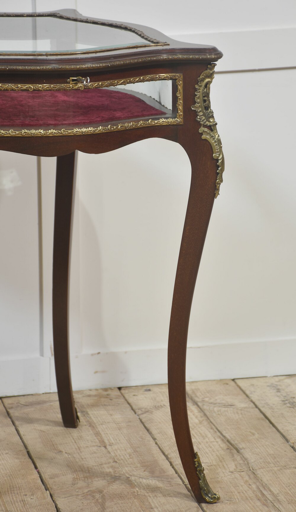 Surrounding bevelled glass panels offer a clear view of the interior from all sides, while the table rests gracefully on elegant cabriole legs finished with gilt metal sabots. This exquisite piece combines delicate proportions with luxurious detailing, capturing the timeless elegance of French craftsmanship.