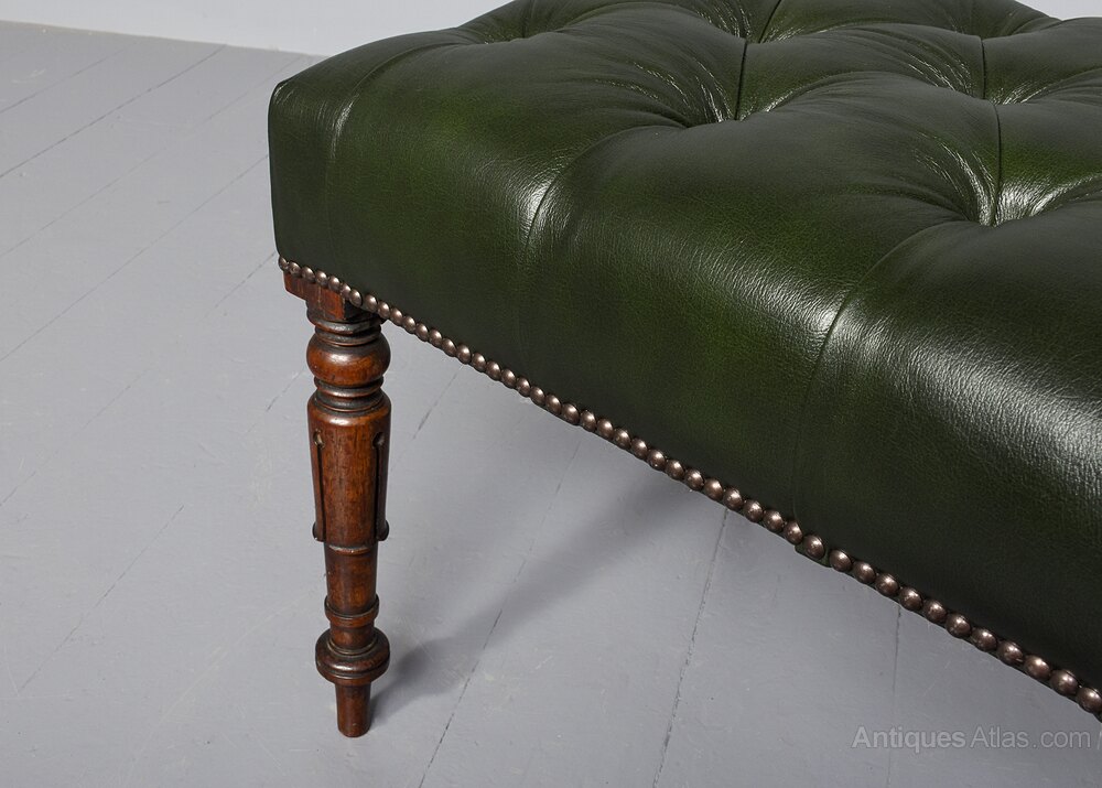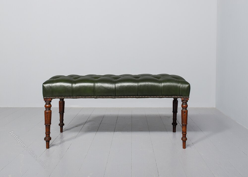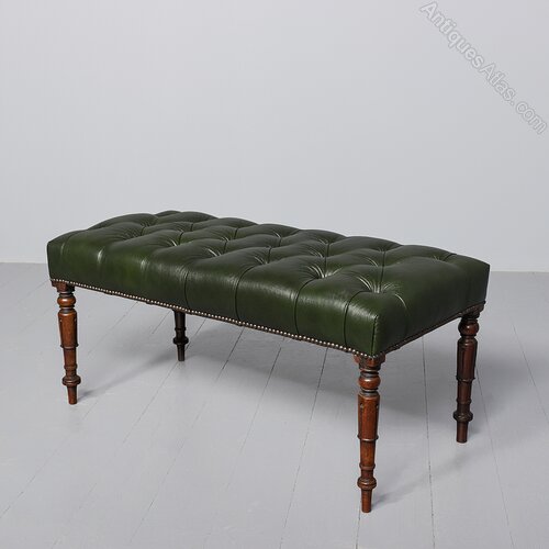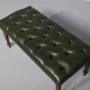Circa 1840 with adaptations. Regency leather upholstered mahogany-framed long bench/stool. The top recently reupholstered in quality green buttoned hide with brass studding along the sides. All supported on tapering, ring turned, fluted legs with a lovely colour and patina.