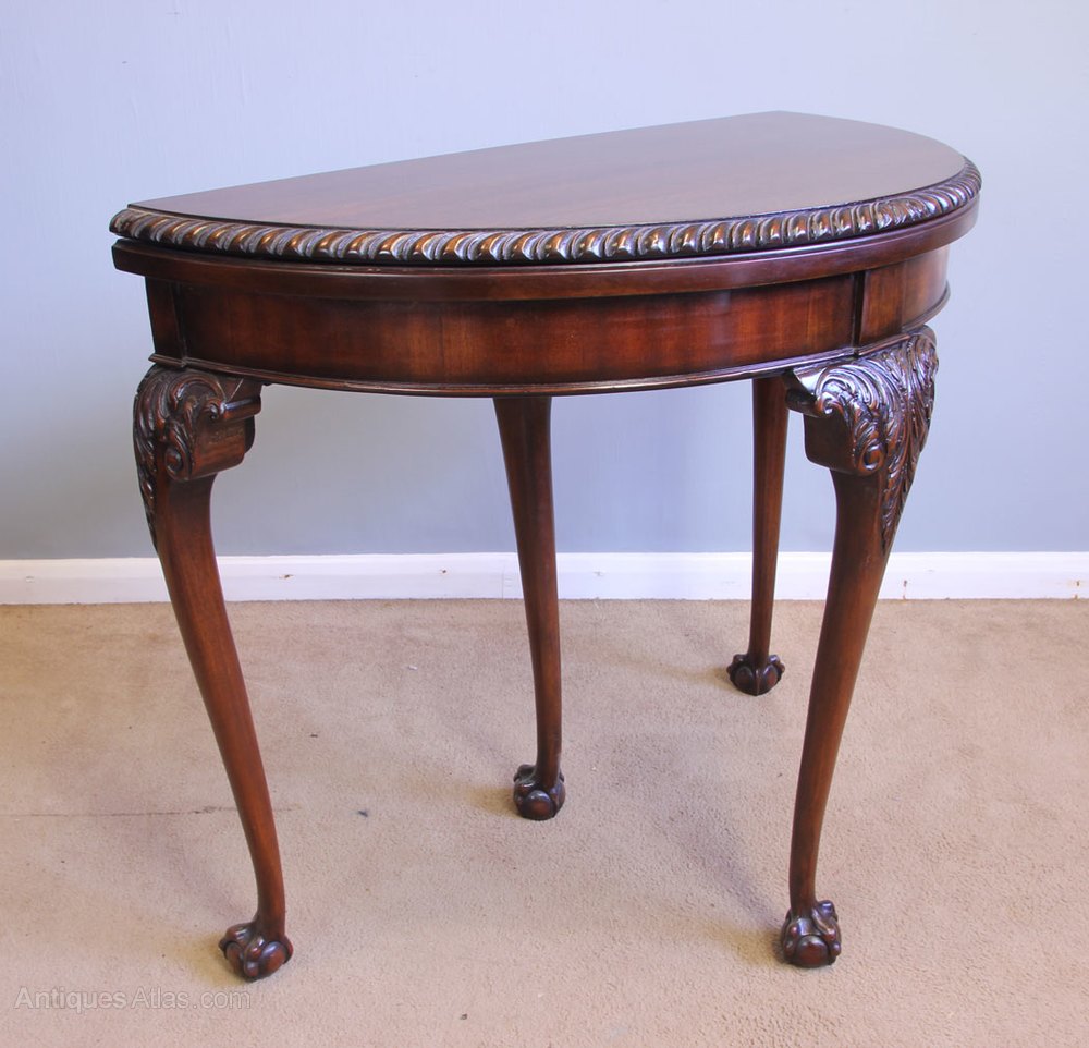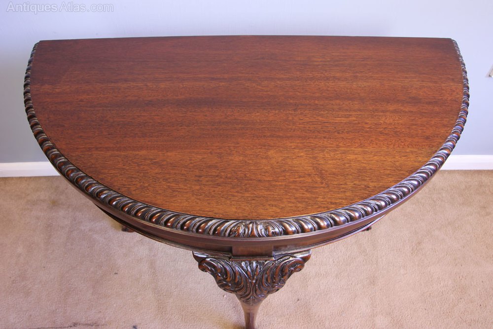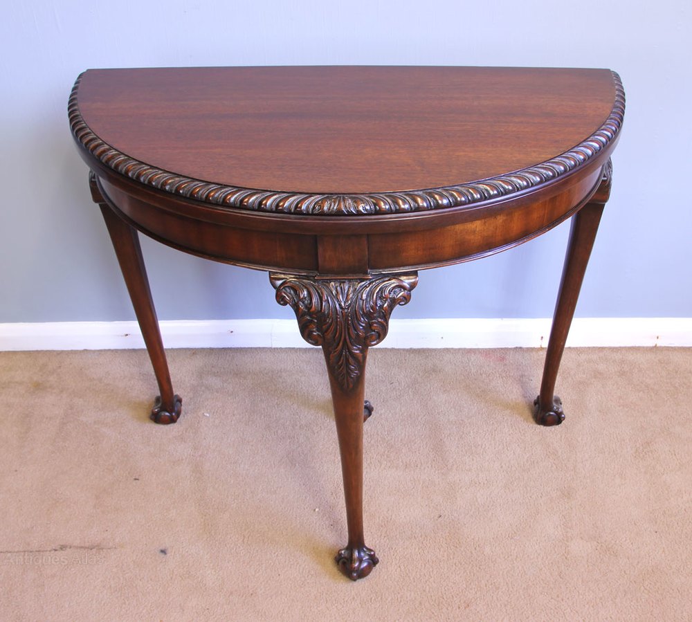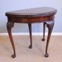 Antique Mahogany Games Card Table Console Side Table. This Antique mahogany games / console / side table has a lovely mahogany top with carved edge detail with mahogany skirt under. All supported by four queen anne style legs with carved and scroll detail and ball and claw feet.