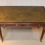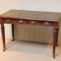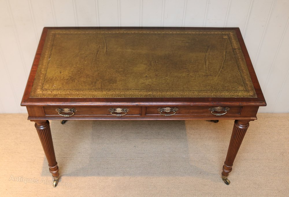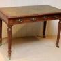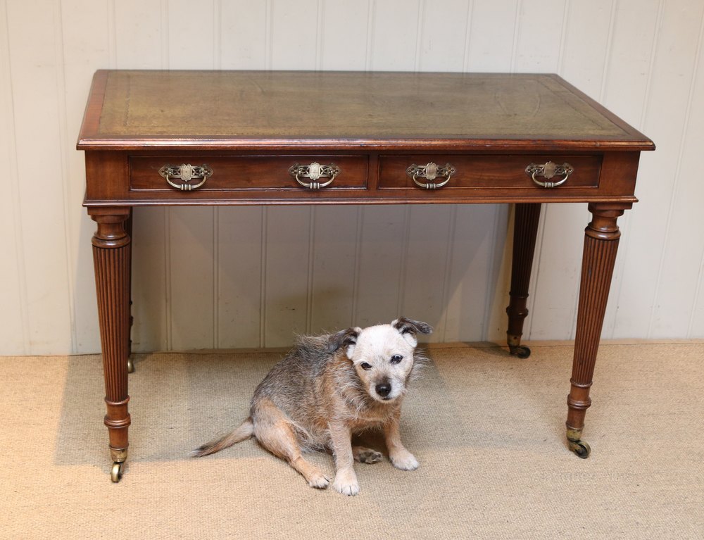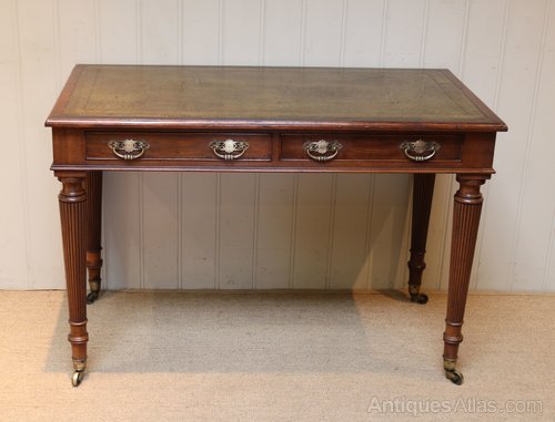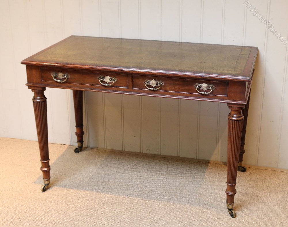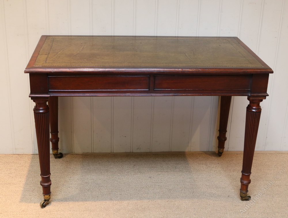 Mahogany Gillows design writing desk ,having a green leather top above two drawers ,raised on turned reeded supports terminating in brass castors.The rear of the desk is finished enabling it to stand alone , there is an original makers label to one of the drawers .The height to the undertier is 59.5 cm