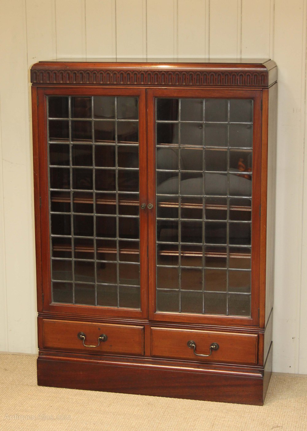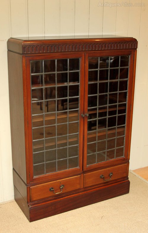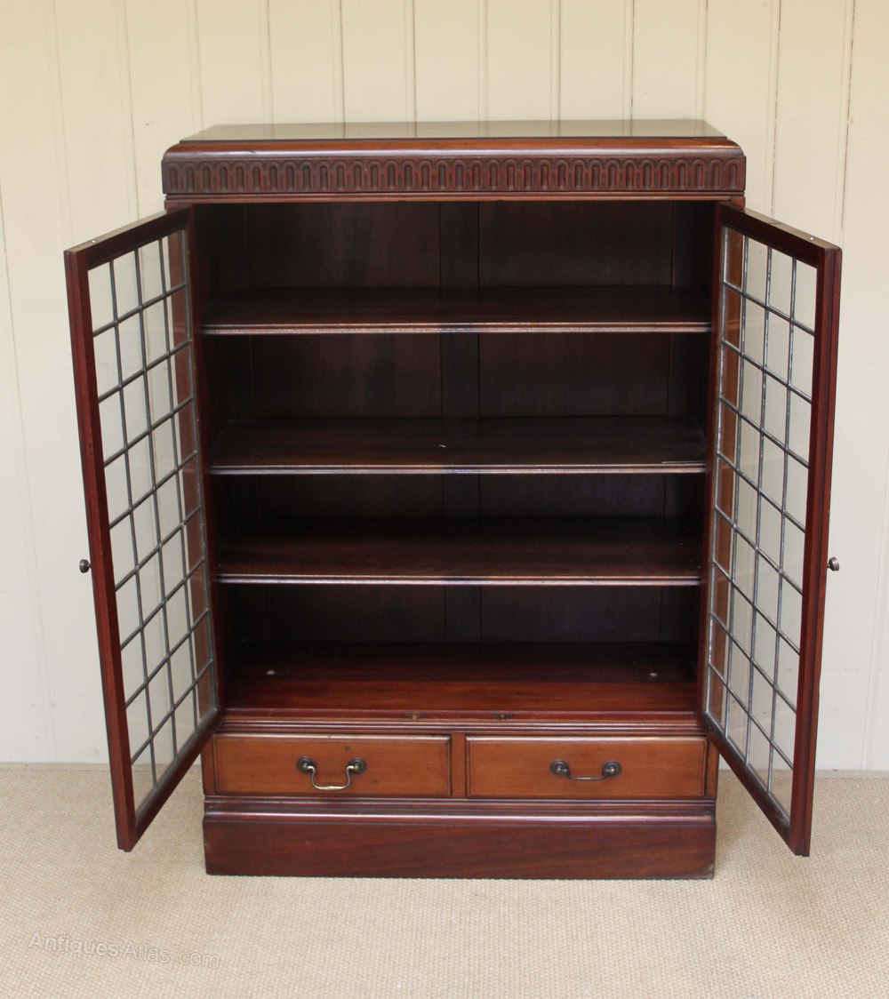 Mahogany two glazed leaded door bookcase having three internal adjustable shelves with two drawers to the base