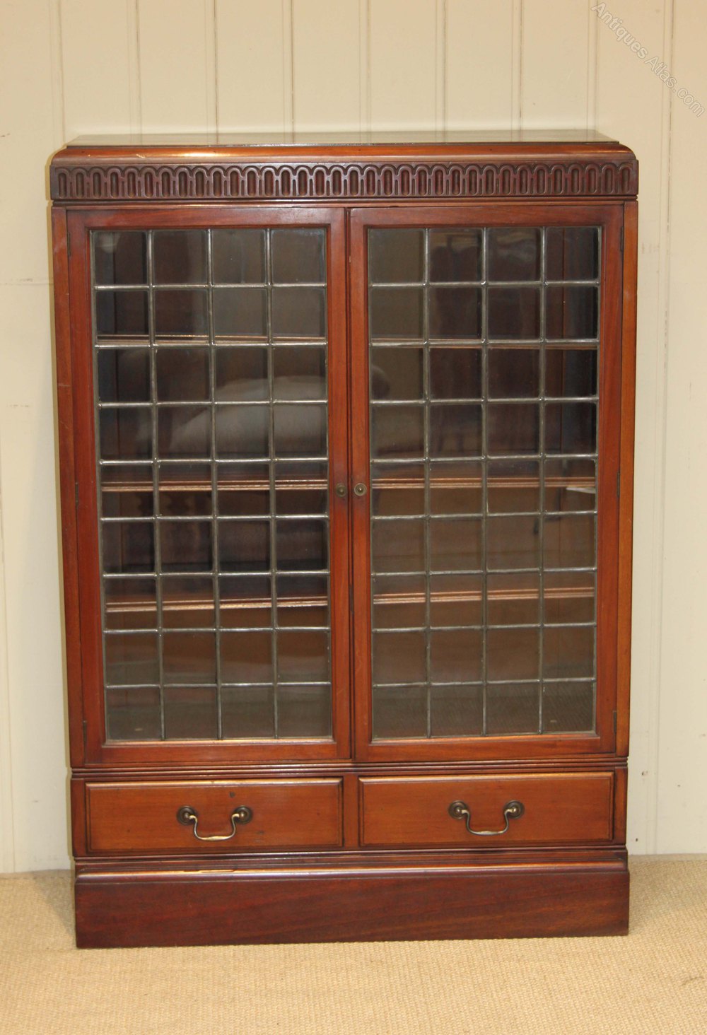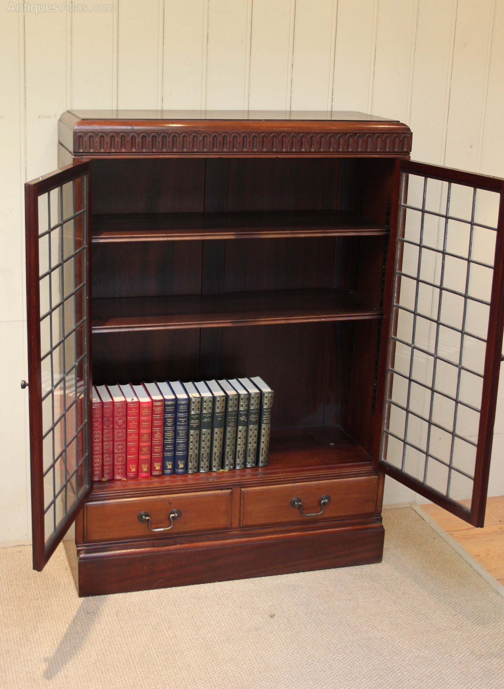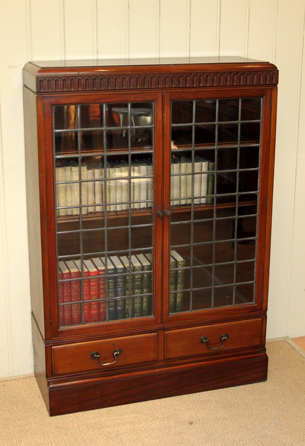 Mahogany two glazed leaded door bookcase having three internal adjustable shelves with two drawers to the base