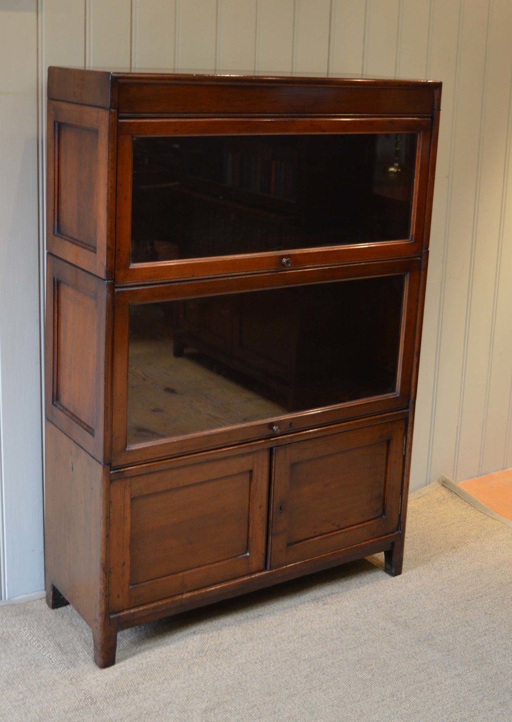 Three tier mahogany globe wernicke style bookcase. Having two glazed up and over doors above a cupboard base.
