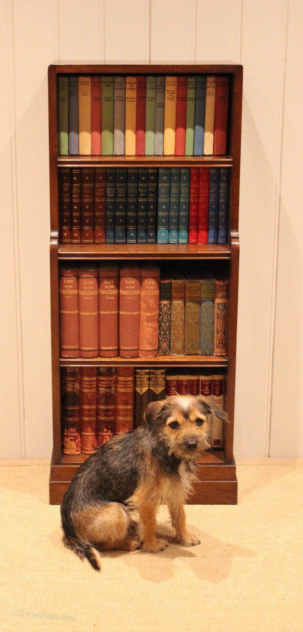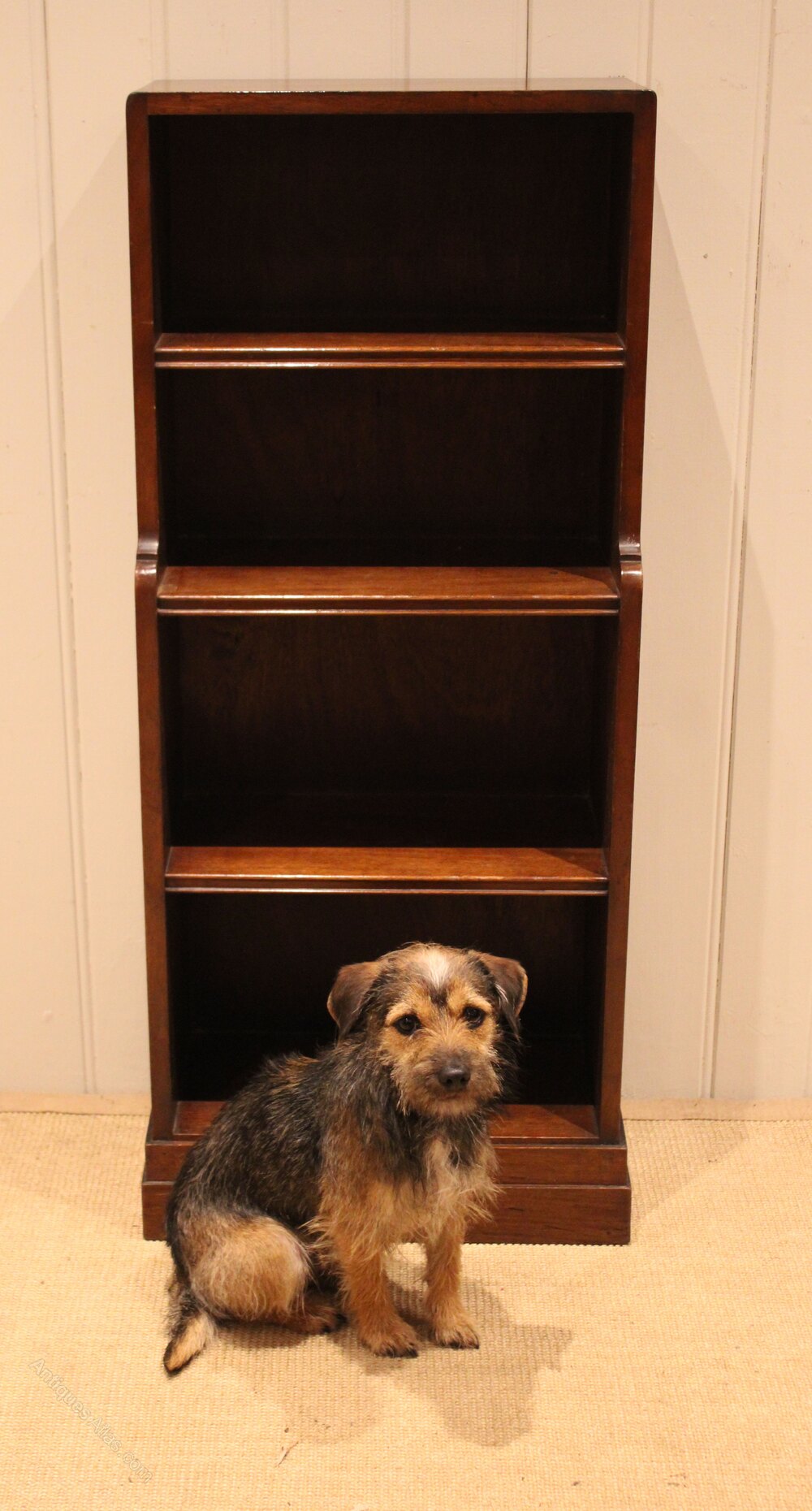Mahogany open bookcase having three fixed graduated shelves , raised on a plinth base . The shelf dimensions are 41.5 cm wide x 22.5 cm deep and from the bottom up 25 cm high , 25 cm high , 20 cm high and at the top 20 cm high .
