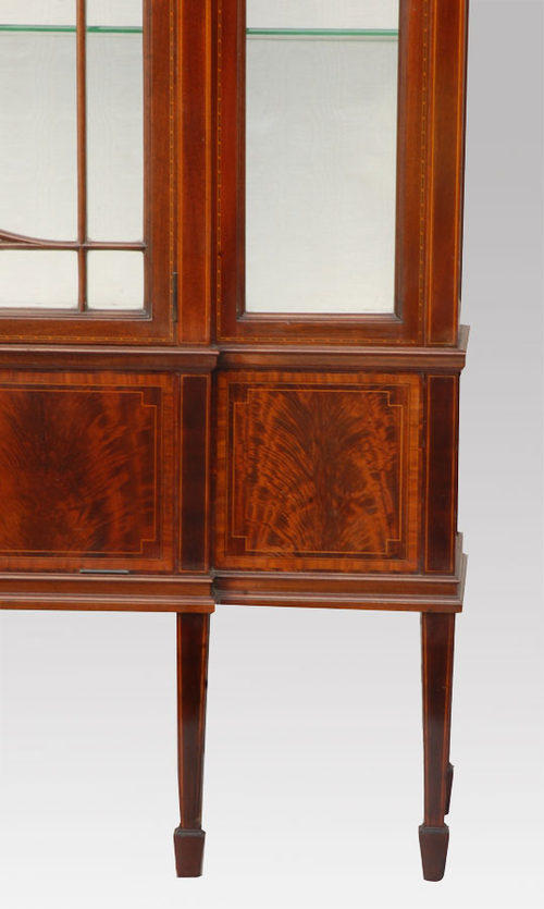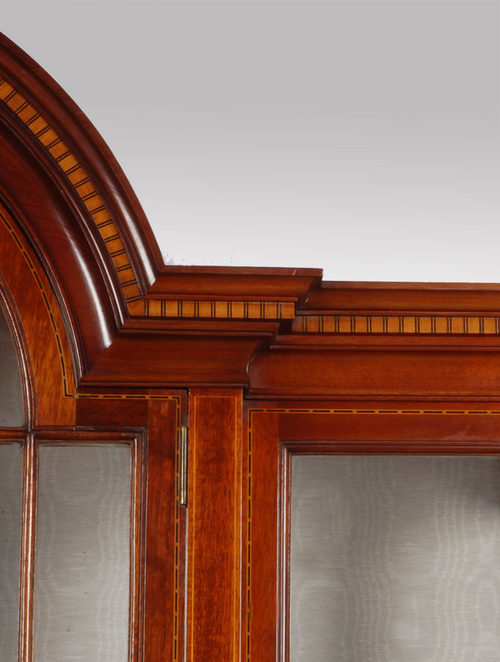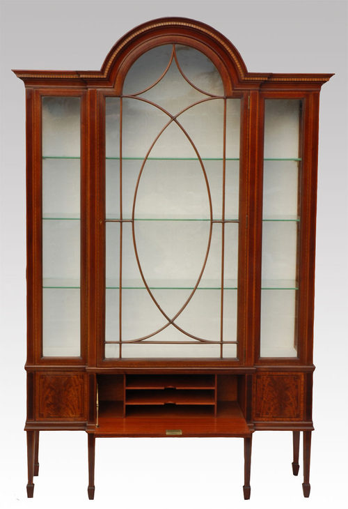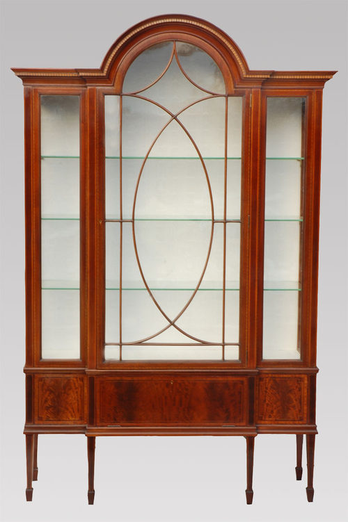 A mahogany and inlaid dome topped display cabinet,the break front fitted with a single astragal glazed door flanked by glazed panels and sides, opening to three plate frixed glass shelves, with a pull down cross banded door beneath, flanked by similar panels, raised on tapered square legs with spade toes